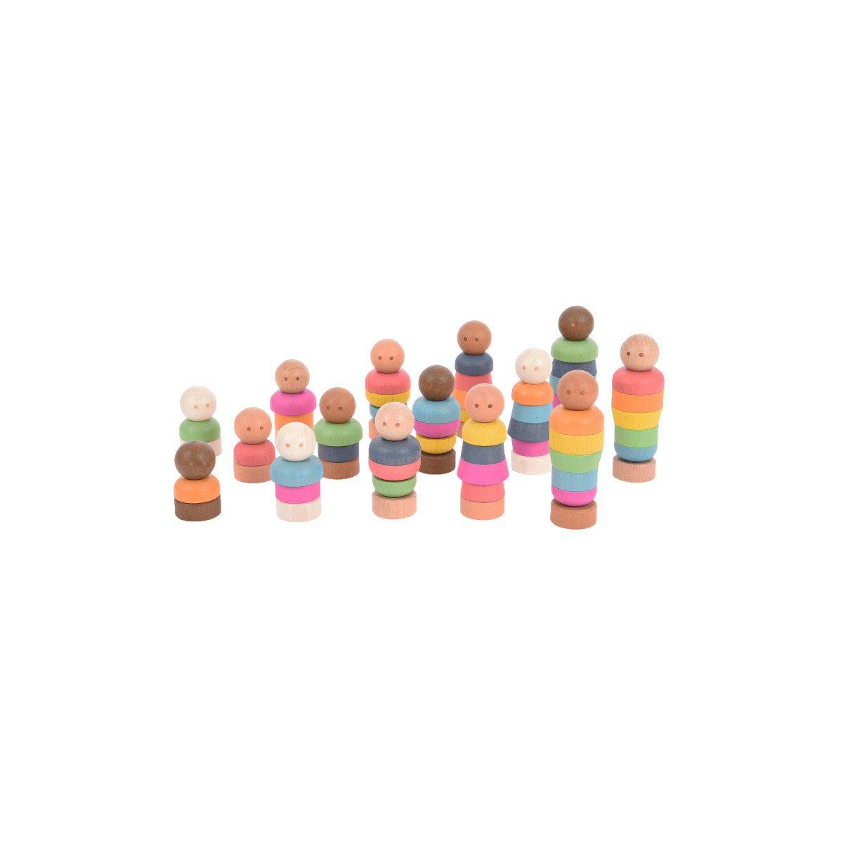 This set includes 15 bolt figures in 5 sizes and skin tones. It also includes 45 nuts in different sizes and 7 colors: red, orange, yellow, green, blue, indigo and purple. Use the "feet" to screw the nuts in place. Children can screw on the pieces to create unique characters of different colors, shapes and sizes. Use this set to open discussions about inclusion and diversity through play. The simple design and various skin tones mean these figures can represent anyone! Use these colorful figures for imaginative play, color recognition and sorting. Children can improve their fine motor and descriptive language skills as they build new figures every time they play. Use these open-ended figures for role or loose parts play. Made from high-quality materials, these figures are designed to last for years of home or classroom use. The chunky wooden design is also the perfect size for little hands. Includes a cotton storage bag. For ages 4+. Includes a storage bag. Size of heads: 1.3" dia. Size of bodies: 2.2"H, 2.8"H, 3.3"H, 3.9"H and 4.5"H.