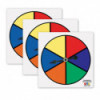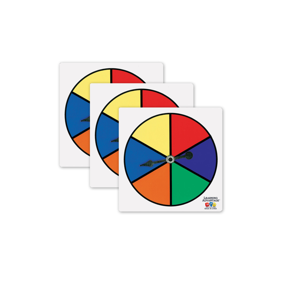 One of the most flexible manipulatives for creating random events for math games and activities such as probability experiments. 4" square plastic with a free-spinning, metal, arrow spinner. Each set of Six-Color Spinners includes 5 write on/wipe off plastic spinners with 6 colored sections. Sold as 3 sets for a total of 15 spinners.