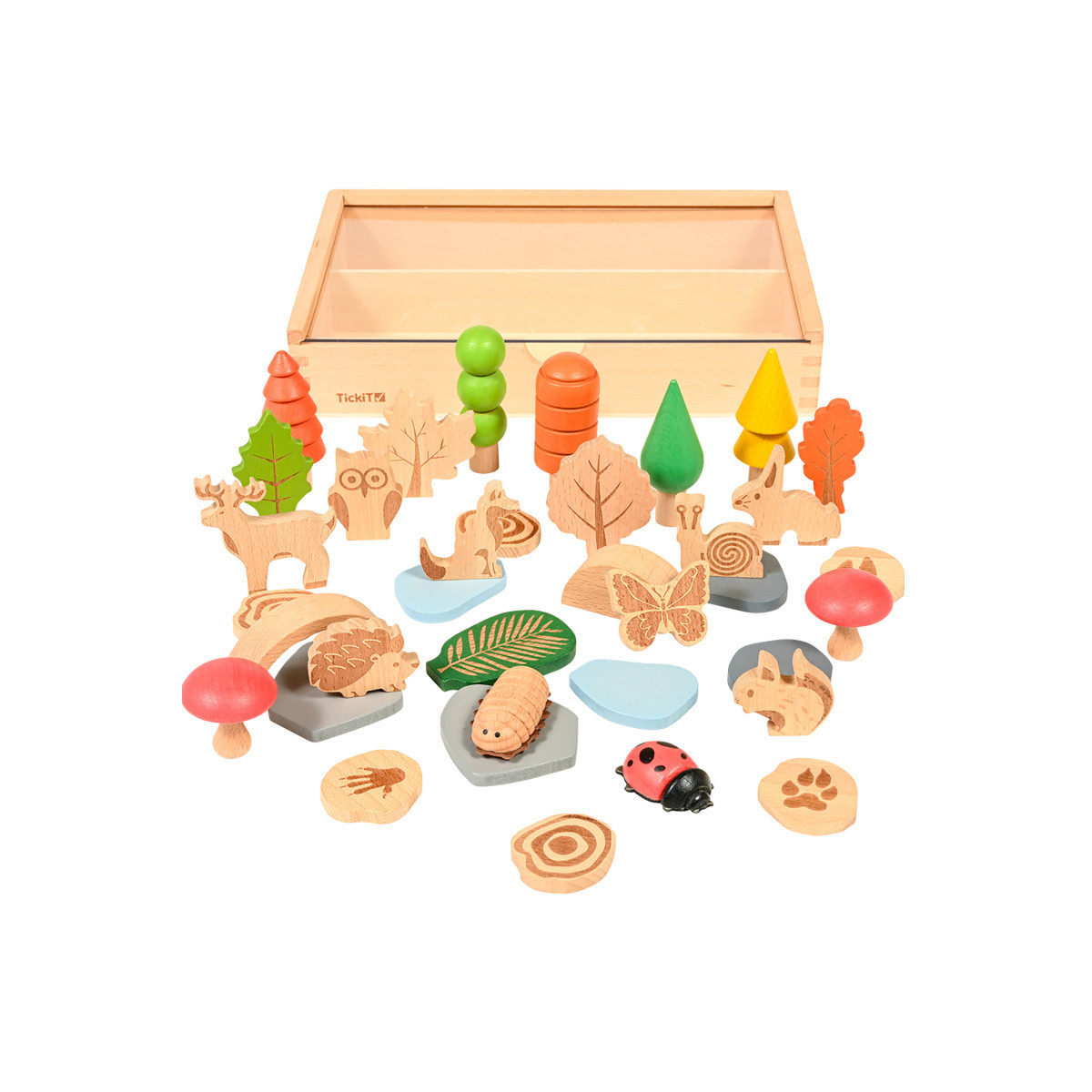 This set features an assortment of 37 woodland shapes. Create relaxing small worlds with little critters, stones, trees and more. These wooden toys are perfect for open-ended, creative play. Use descriptive language to explore storytelling and world-building. All the pieces feature a smooth, natural wood grain to promote comfort and relaxation. Some pieces are designed with added indents and textures. Made with durable beechwood, this set is designed to last for years of play. Use the wooden box and clear acrylic lid for easy cleanup and storage. Add this set to calming corners, playrooms and sensory bins. Includes: 5 trees, 5 leaves, 2 minibeasts, 2 toadstools, 6 stones and water shapes, 6 log slices with animal footprints on the reverse side, a 2-piece bridge arch, and a wooden box with a clear acrylic lid. For ages 3+. Size of tray: 10.6"H x 7.3"L. Size range: 1.5"H x 1.5"L - 2.4"H x 2.1"L.