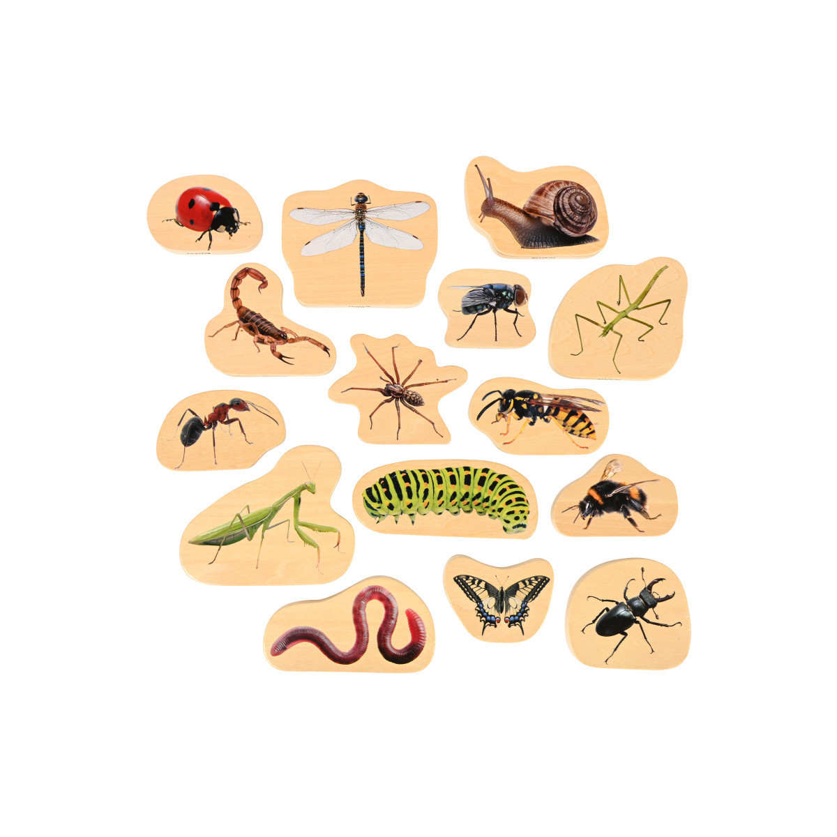 15 CRAWLING CRITTERS -- This set features 15 double-sided, wooden blocks with printed minibeasts. Encourage kids to use their imagination as they examine everyday insects.