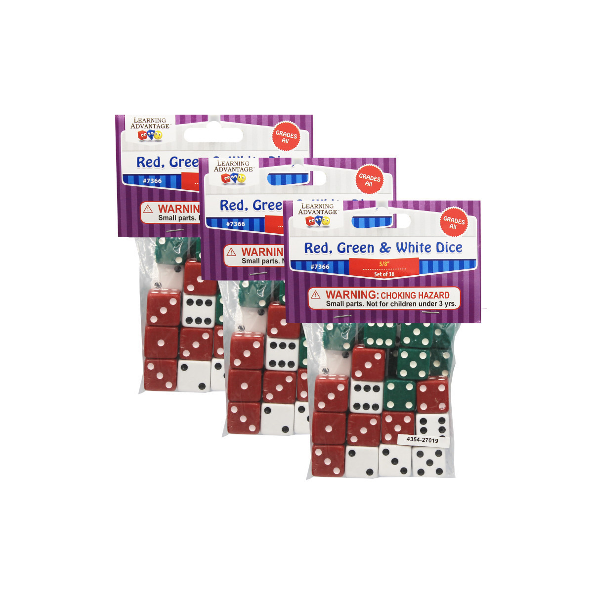 One of the most versatile manipulatives, these 5/8" dice can be used to explore problem solving such as number concepts, operations, probability, statistics, pre-algebra and more. 36 dice per pack. Sold as 3 packs for a total of 108 dice.
