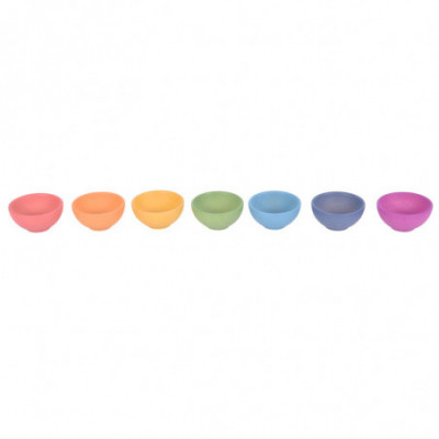 This set of seven natural Beech wood bowls comes in seven different colors: red, orange, yellow, green, dark blue, light blue and pink. These muted, wooden bowls are stained with non-toxic paint that displays the wood's natural grain. The smooth surface and bright colors promote calm and concentration. These bowls are made from sustainably cultivated European beech trees. They're also safe for toddlers aged 10m+. | Size: 3.6" Dia.