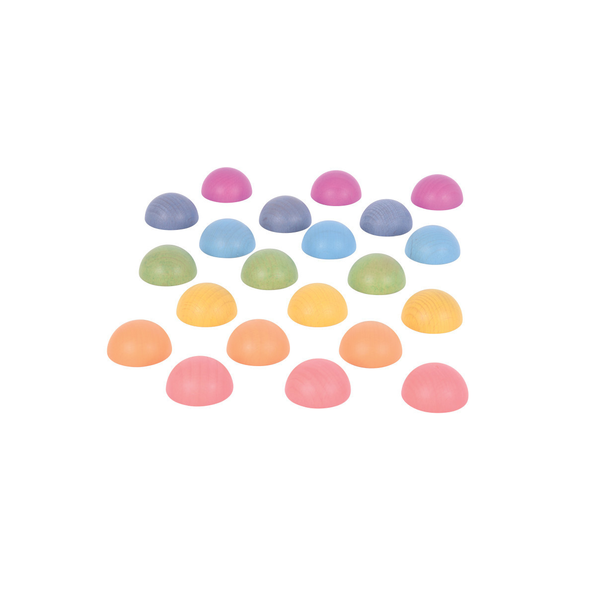 - INCLUDES 21 WOODEN SEMISPHERES -- This natural set includes 21 Beech wood semispheres in red, orange, yellow, green, dark blue, light blue and purple. There are 3 semispheres of each color.