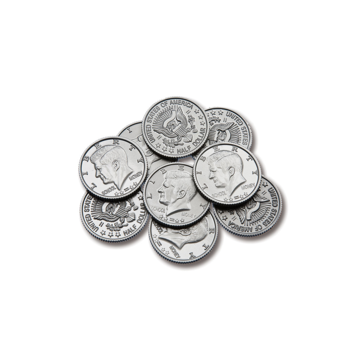 Introduce addition and subtraction with play half-dollars! These versatile, real world manipulatives can be incorporated into math lessons anywhere. Featuring a detailed image of John F. Kennedy and a shiny silver color, these pretend plastic half-dollars are designed to match real US half-dollars. A realistic alternative to actual half-dollars, use this set to reward children for chores or good grades. Or, create your own activities and lessons! This set includes 50 Play Half-Dollars. The plastic coins are designed, sized and colored to match real half-dollars. Coin size: 1.25" dia.