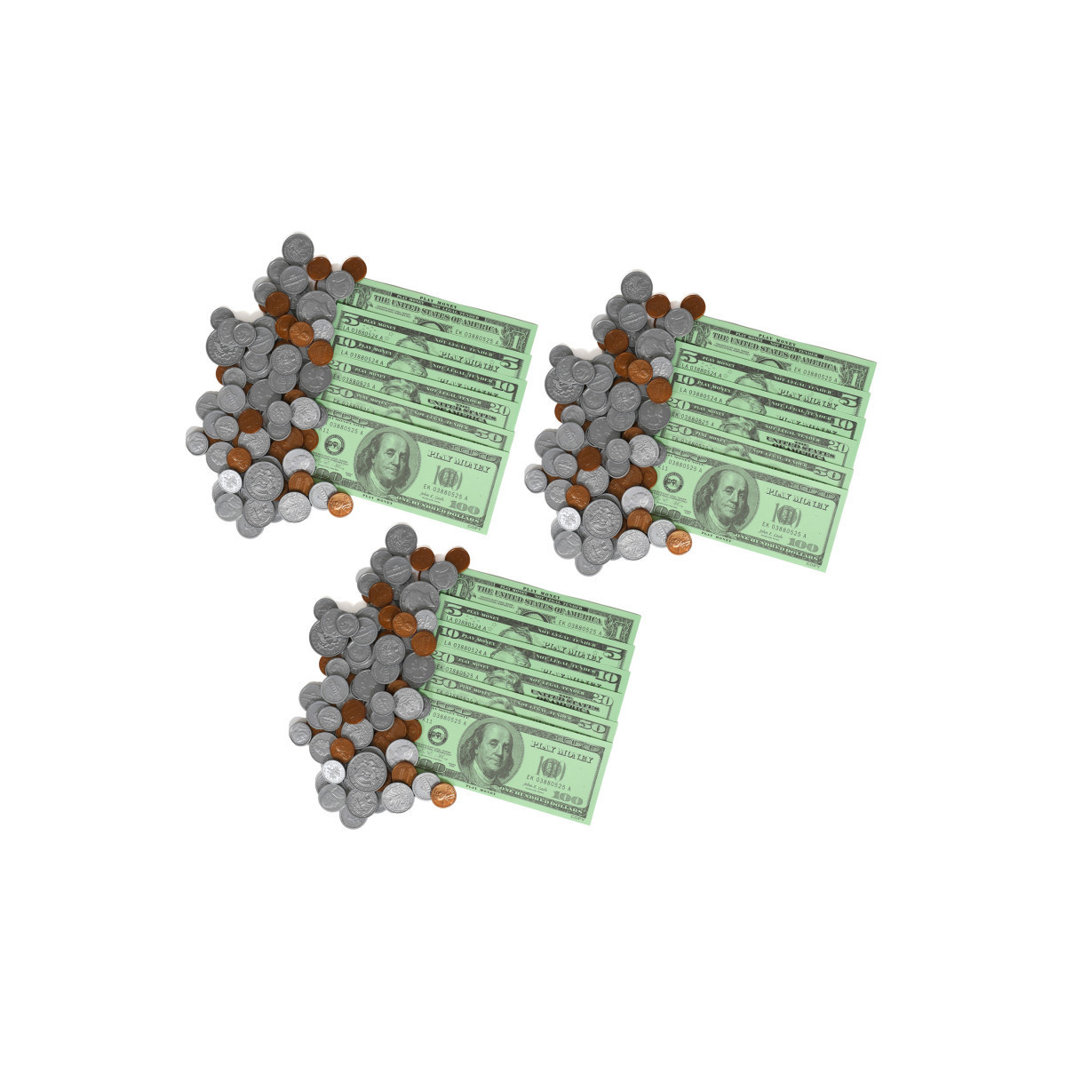 Each set of play money includes 105 bills and 94 coins. Give children a hands-on method to practice fundamental math and financial literacy concepts that will last a lifetime. Count change, sort bills and coins, conduct educational transactions, and more. These play coins and bills are the approximate size and color of real dollar bills and coins. They also feature double-sided, realistic illustrations. Packaged in a resealable bag, take these tools anywhere. Each set includes 35 ones, 25 fives, 20 tens, 15 twenties, 5 fifties, 5 hundreds, 30 pennies, 20 nickels, 20 dimes, 20 quarters and 4 half dollars. For ages 3+. Size of bills: 6.1"L. Size of quarter: 1" dia. Sold as 3 sets for a total of 597 pieces.