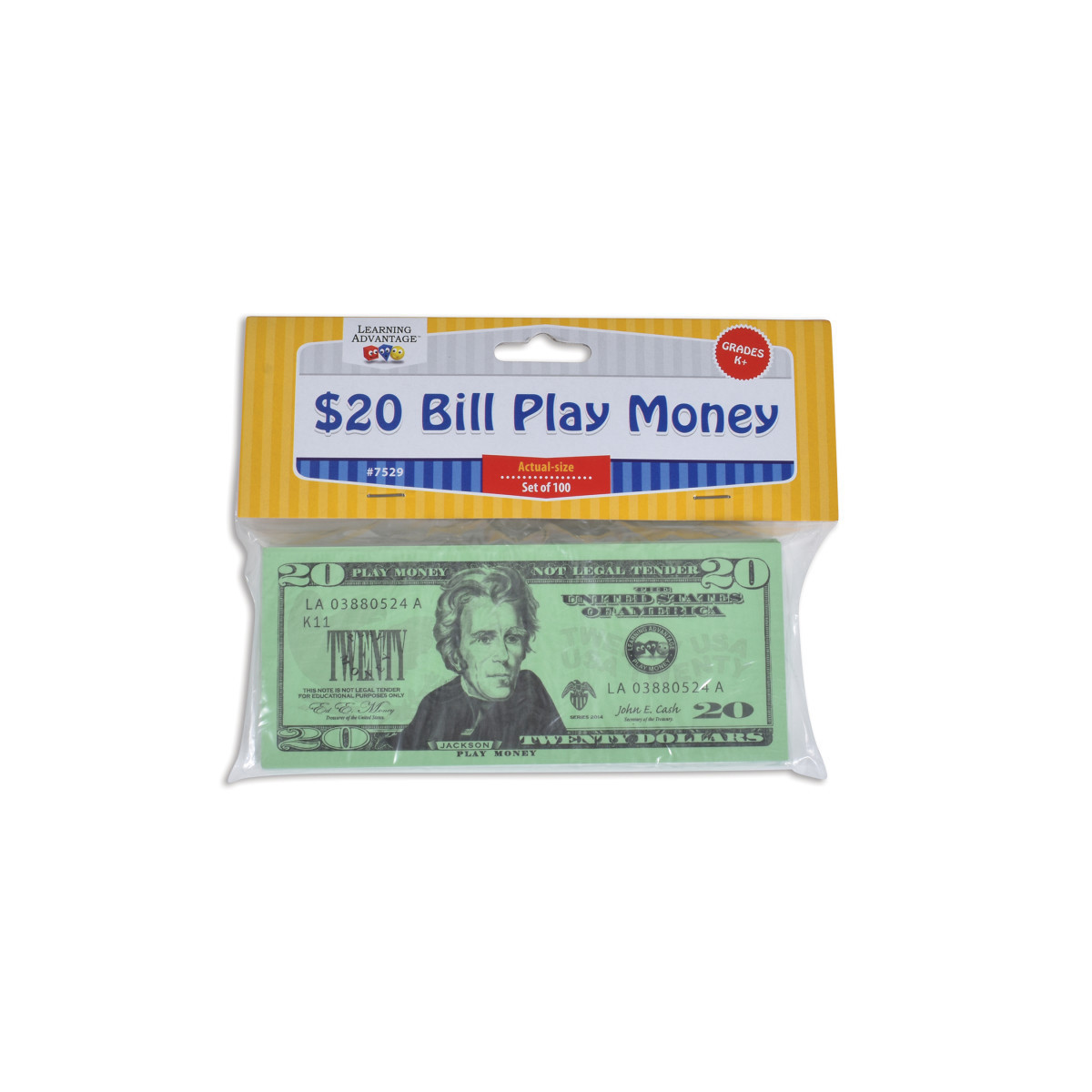 100 $20 BILLS INCLUDED -- This set of twenty dollar play bills is great for solitary or group play and an ideal resource for the home, center, classroom or playroom.