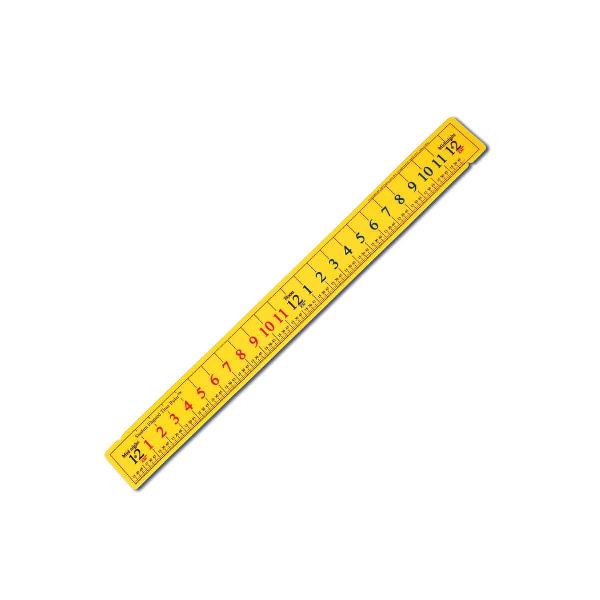 This unique, write on wipe off time tool allows students to measure and teachers to demonstrate time in a number line format where they can visually see where the time goes! Elapsed time and duration of time subjects are difficult for students to grasp and digital clocks only make it harder as students are failing to adequately learn to tell time using analog clocks. The Elapsed Time Ruler™ was created to address this difficulty and help teachers instruct students on elapsed time and duration of time questions. The student version of the Elapsed Time Ruler™ is designed to interlock at each side marked "midnight" to create one continuous time line. Student version is laminated on the front to allow the use of dry erase markers to mark the beginning and ending times if needed. Think of this time tool as an analog clock unwound into a 24-hour format with A.M. marked in red and P.M. marked in blue. Rulers measure 17" x 1 3/4".