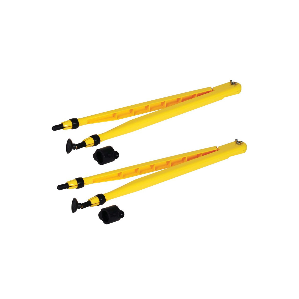 Draws circles over 50" in diameter for whiteboard or chalkboard demonstration. Constructed of quality plastic. Includes adjustable attachment for use with chalk or markers and attachments for various mounting possibilities such as suction cup, rubber tip, and steel tip. Legs measure 17" long. Rubber pad in joint helps lock the compass legs in place. Pack of 2 compasses.