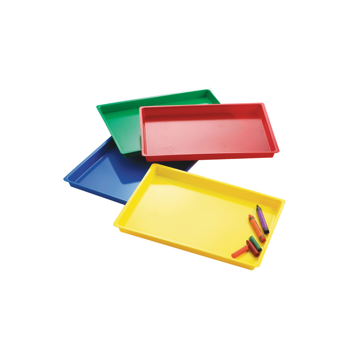 The possibilities are endless with this set of 4 heavy-duty multi-purpose trays in 4 colors! Keep art projects neatly contained and organized; large enough in size to fit a standard 8.5" x 11" piece of paper or a worksheet with plenty of room for manipulatives to fit inside tray on the sides. Suitable for finger painting projects, collaging, clay or playdough, and other messy art projects. Or use for individualized sensory activities filling trays with, water, sand, plastic sensory pellets, beads and more! Trays measures 12" x 16" x 1" deep".