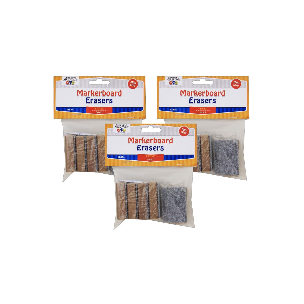 Great for students to use for classroom activities! Each set includes five erasers for dry-erase materials. Each eraser measures 2" x 1.5" x .5". Sold as 3 sets for a total of 15 erasers.