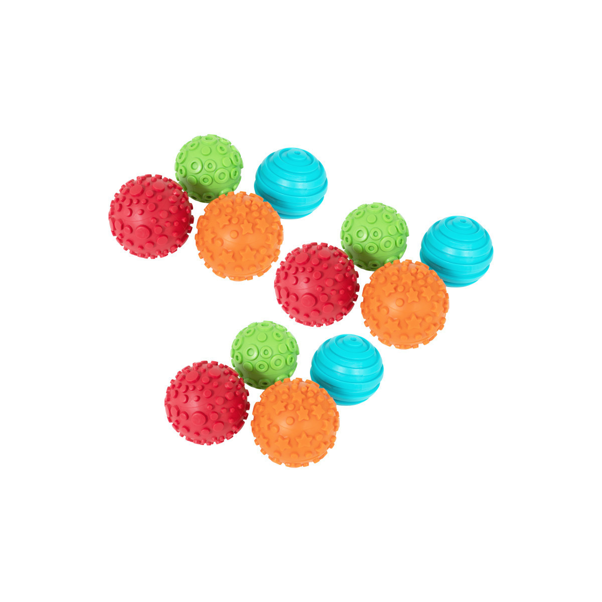 THREE SETS OF SPHERES-Each set includes 4 textured rubber spheres, each with a different pattern: stars and dots, parallel stripes, circles and dots and differently sized dots. Sold as 3 sets for a total of 12 spheres.