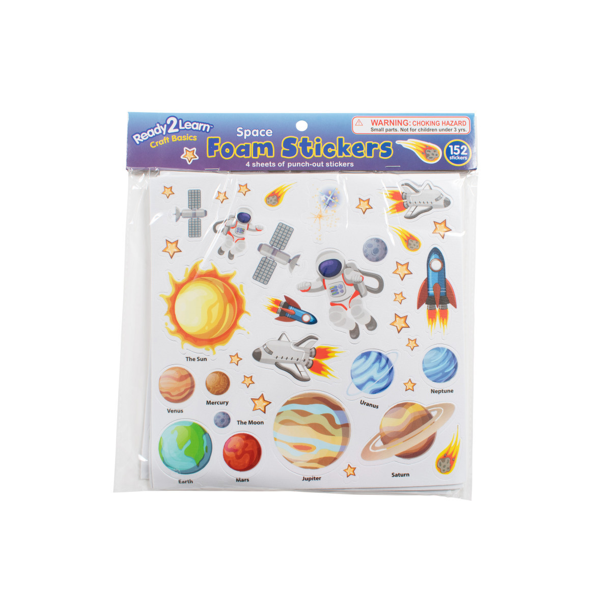 152 SPACE STICKERS -- This space-themed sticker pack includes 4 foam sheets, each with 38 punch-out stickers in 17 different images. Decorate with planets, stars, rockets and more!