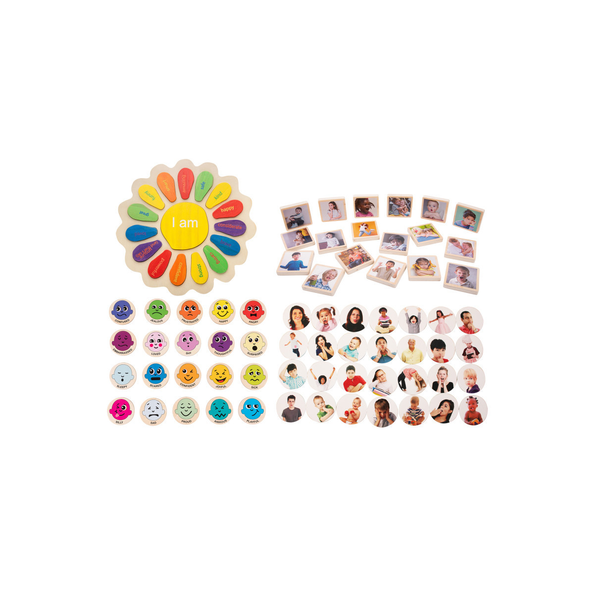 The Feelings & Emotions Kit includes a set of 18 My Emotions Wooden Tiles, Feelings and Emotions Matching Pairs Game, I Am Me Puzzle, and Emotions Wooden Magnets.