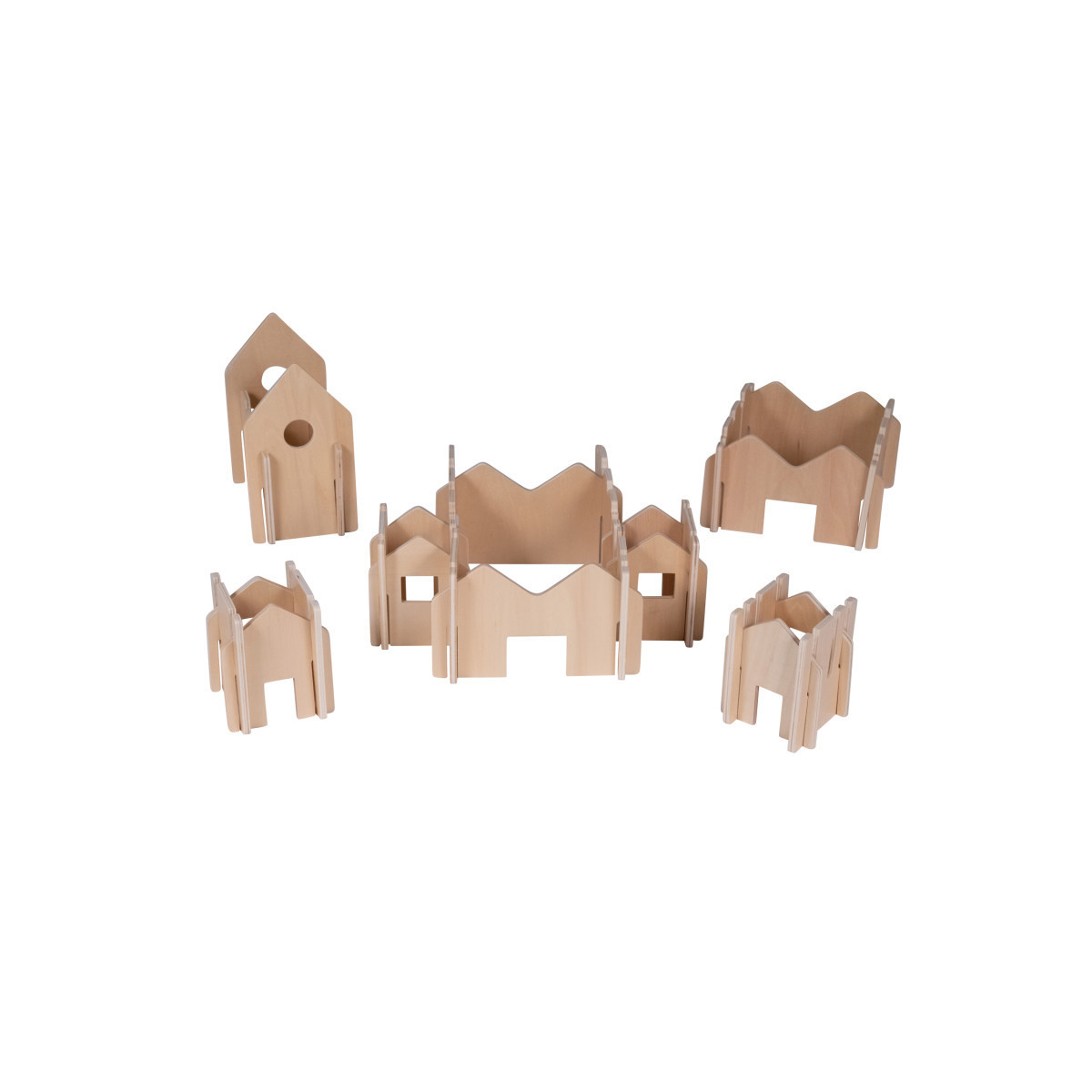 - INCLUDES 28 NATURAL PIECES -- This wooden village-themed set features 28 beautiful, open-ended pieces in 10 shapes for endless imaginative playtime!