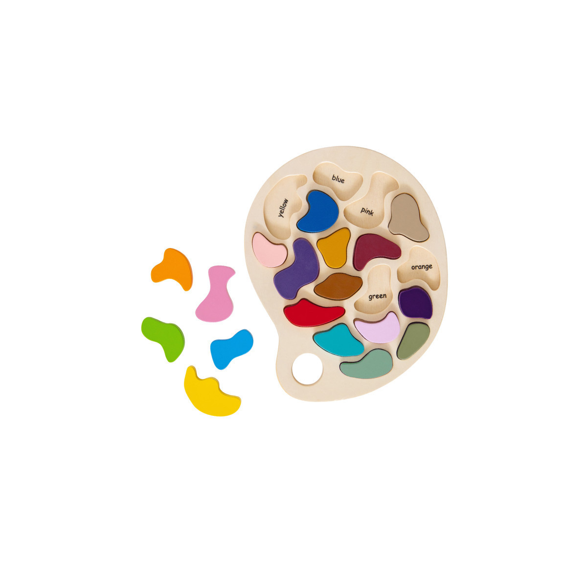 Children can put the puzzle pieces together by using trial and error to fit the unique shapes to the right spaces. They'll also be able to practice naming their primary colors as well as learning a range of new color names! A brilliant colorful set to support the development of your child's problem solving, color recognition and fine motor skills. The Artist Palette Puzzle consists of a palette shaped base and paint color shaped pieces. The names of each color are also printed in the corresponding place on the base of the puzzle. 19 pieces in each set. Made with FSC Plywood and MDF. Suitable for children ages 3+. Size of base: 10"L x 7.5"W. Size of smallest piece: 1.4"L x 0.4"H.