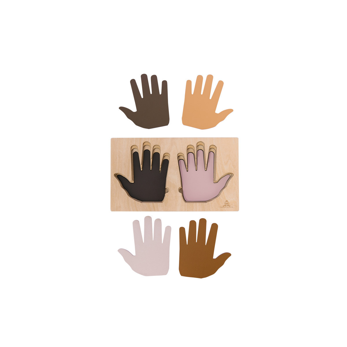This wooden puzzle features a multilevel plywood base and 6 hand-shaped pieces in different skin tones and sizes. Children can practice critical thinking, concentration and spatial reasoning as they decide how to place the hands in the baseboard from smallest to largest. The puzzle also promotes learning about diversity and inclusion through play. Children will feel more included and understanding when they see themselves and others represented in the 6 different skin tones. Made from durable materials, this puzzle is designed to last for years of home or classroom use. For ages 12m+. Size of base: 11"L x 6.5"W x 0.8"H. Size of smallest piece: 4.5"L x 0.25"H.
