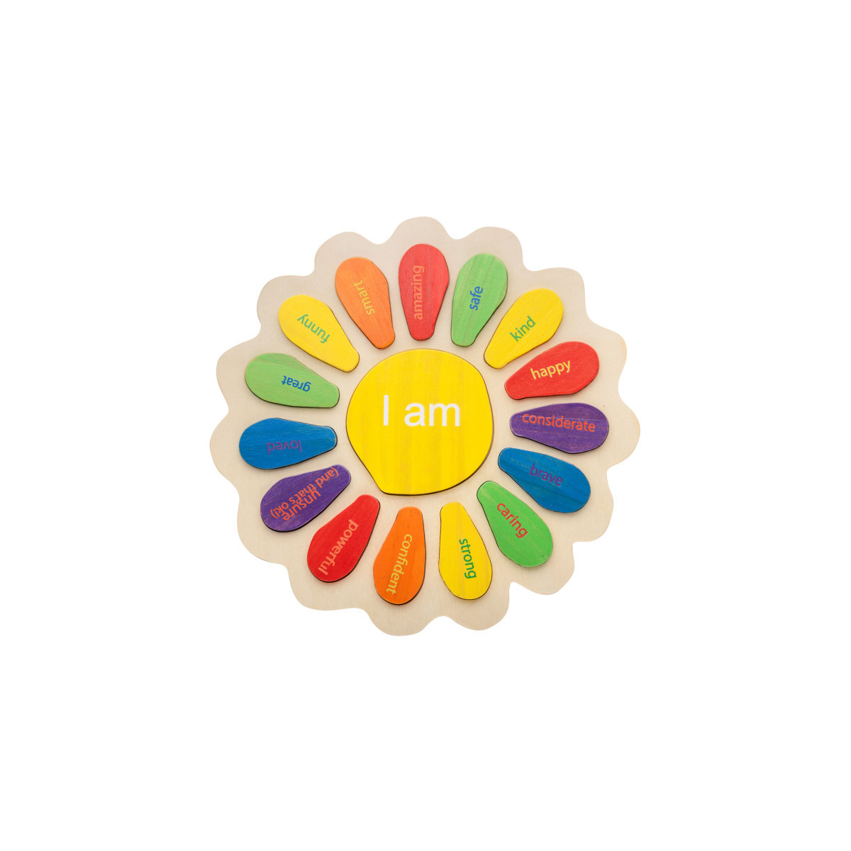 This chunky wooden puzzle features a flower-shaped base, 15 affirmation petals and an ‘I am center piece. Each petal features a different affirmation including funny, brave, smart, kind and more. Match the affirmation petals with the ‘I am center to encourage mindfulness and start conversations about emotions. Foster the importance of empathy with 'I am brave' and 'I am strong' affirmations. Develop confidence as children learn to identify and express their emotions. This puzzle also supports problem solving, concentration, color recognition and more. The pieces are coated with non-toxic paint and the base is sealed with a clear matt varnish. Made from quality materials, this durable, non-toxic wooden puzzle is designed to last for years of home or classroom use. For ages 12m+. Size of base: 13.25"L x 13.25"H. Size of small pieces: 2.9"L x 0.4"H.