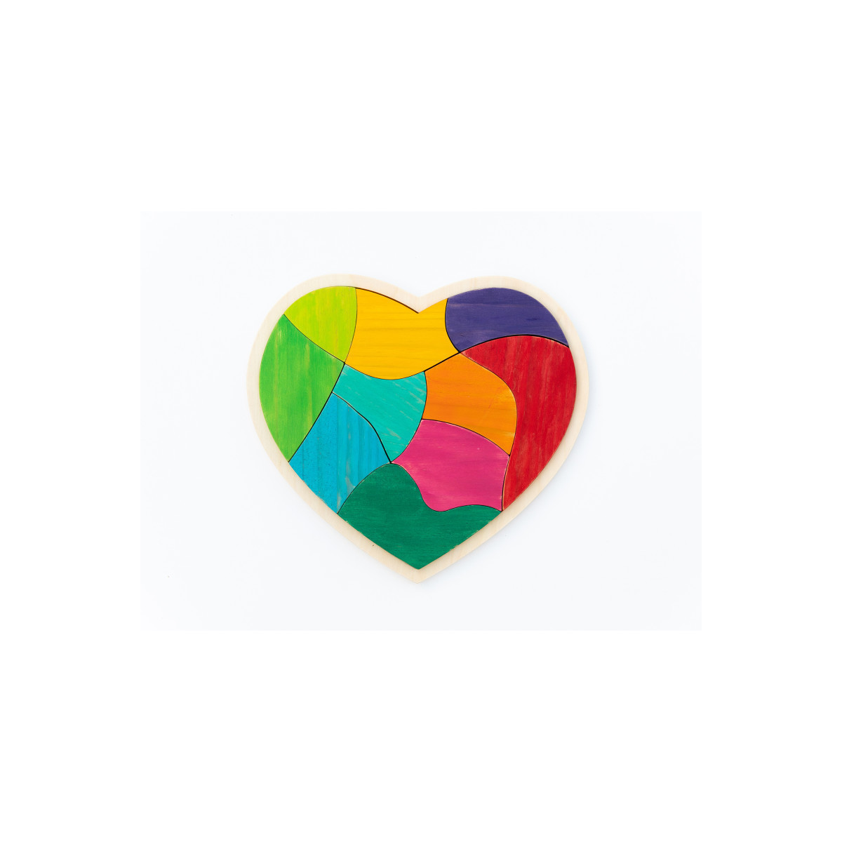 This chunky wooden puzzle features a heart-shaped plywood base with 10 brightly colored wooden pieces. The puzzle solution is printed on the baseboard..