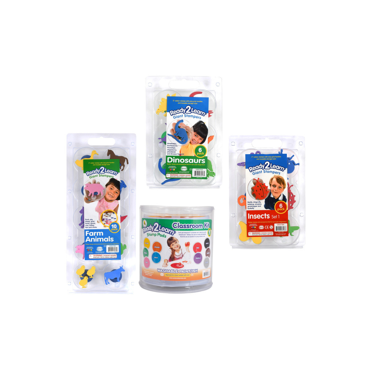 Stamp and create with this classroom Giant Stampers & Stamp Pad Kit! This set includes a 10-piece Jumbo Circular Washable Stamp Pad Set, a 10-piece Farm Animals Giant Stampers Set, a 6-piece Dinosaurs Giant Stampers Set, and a 6-piece Insects Giant Stampers Set.