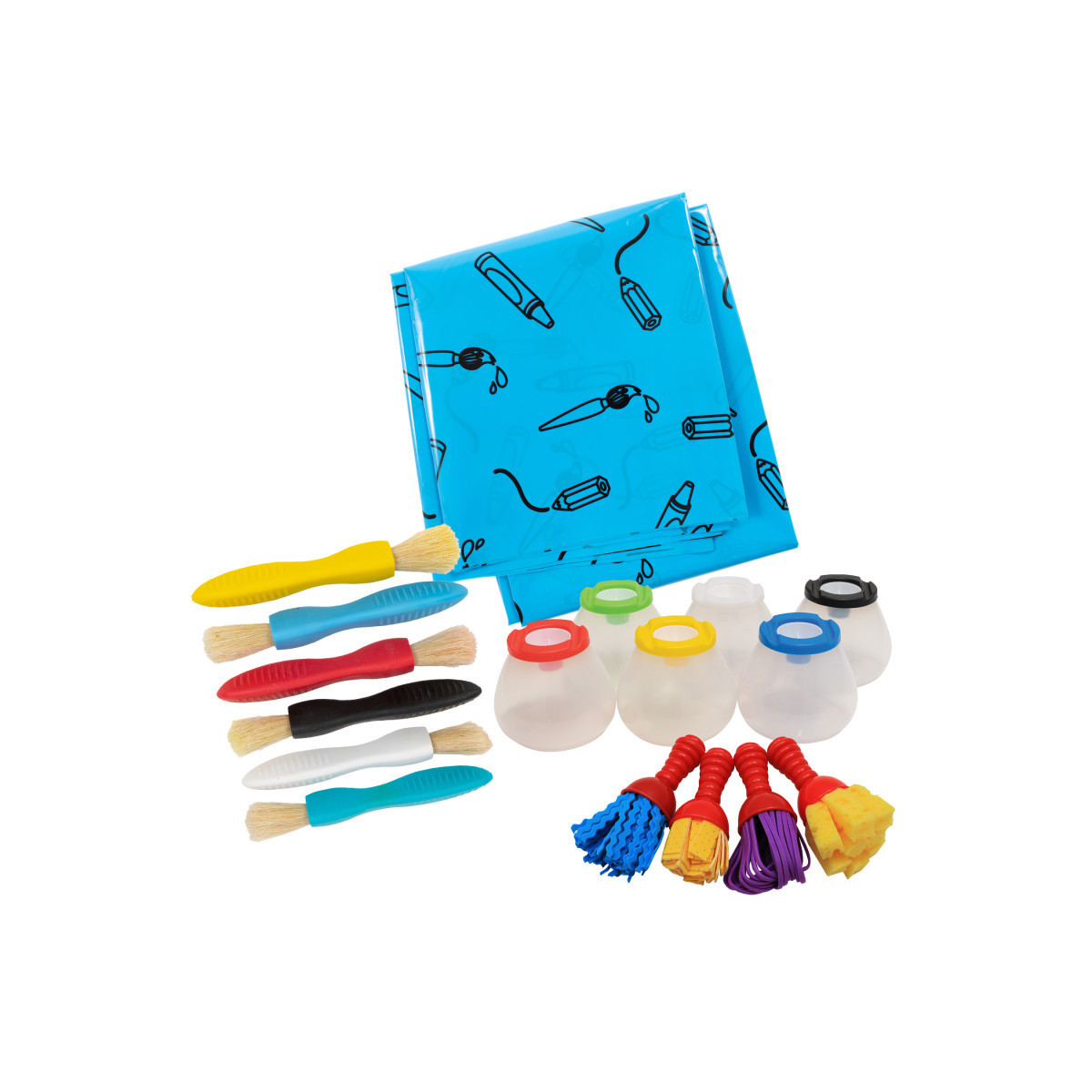 The Drawing & Painting Tools Pack includes 4 different items to create fantastic textures and DIY painting projects: set of 4 textured art tools, 6 triangle grip paint brushes, a messy mat, and 6 no spill paint pots.