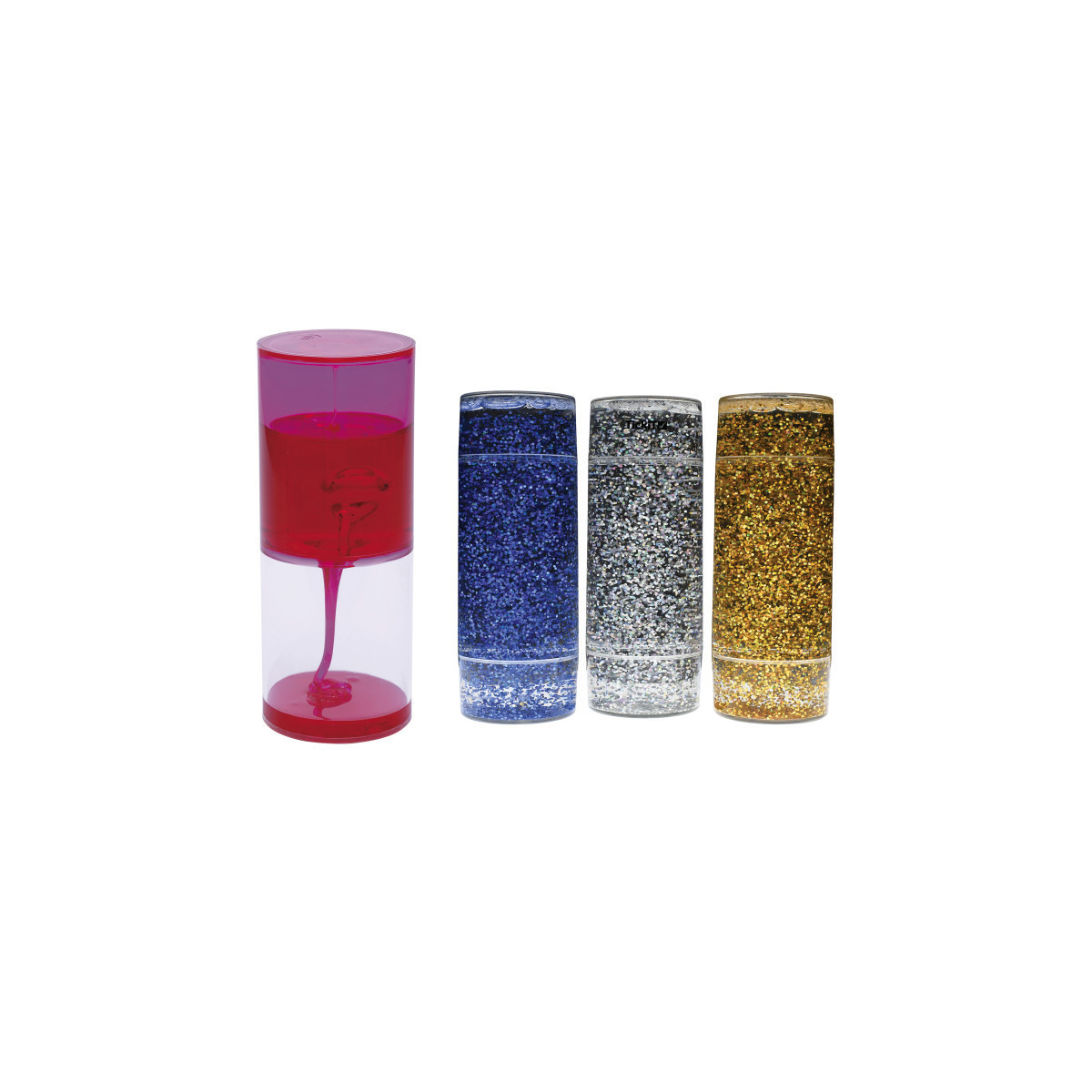 The second part of our set includes three large cylinders, each containing gold, silver, and blue glitter in clear liquid. Watch as the glitter swirls and dances, creating a soothing and enchanting glitter storm. Turning them upside down provides a variety of ways for the droplets to fall or rise, keeping young minds engaged and curious about the simple scientific principles at play. These 3 cylinders measure 5.50" x 2".