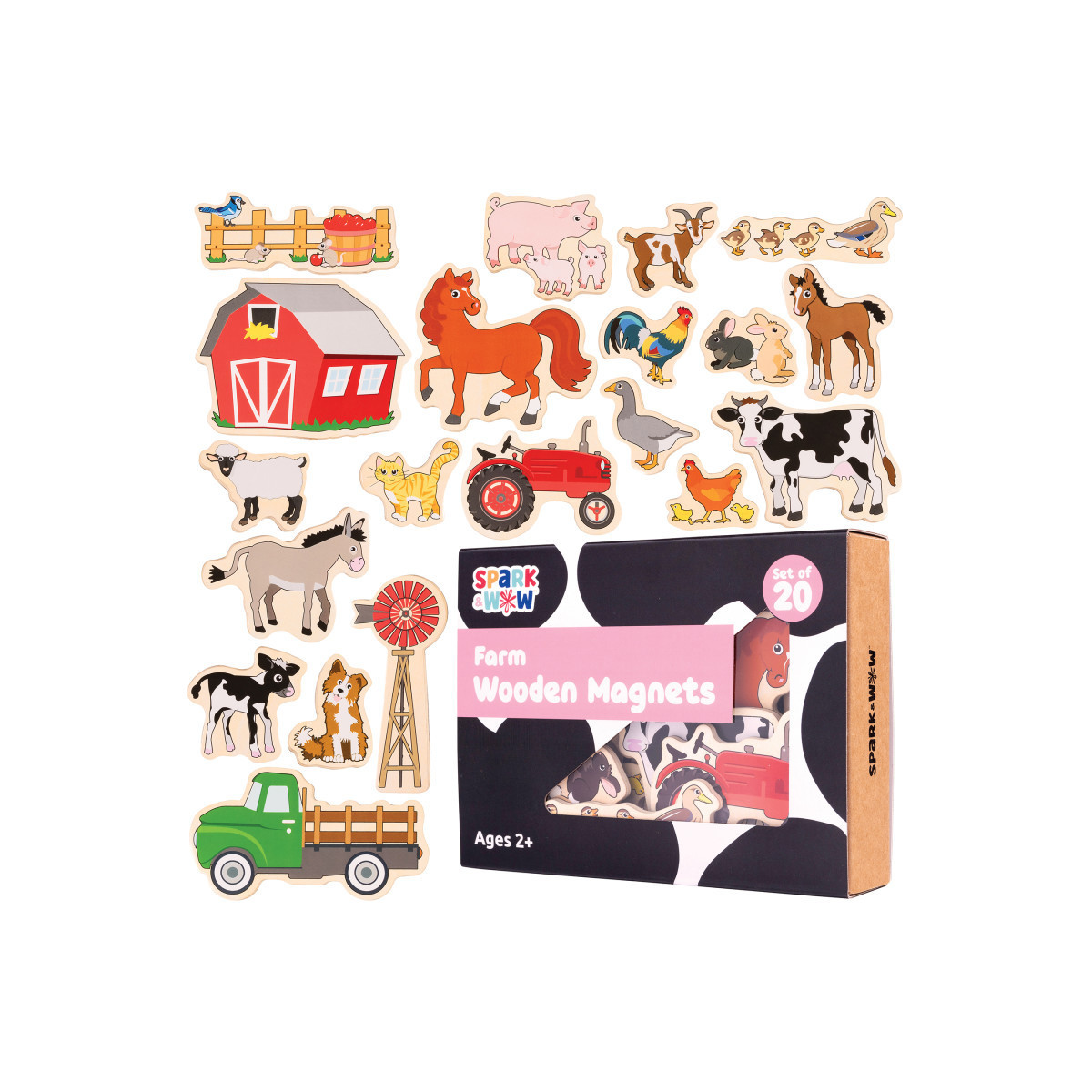 20 DIFFERENT FARM SHAPES -- This wooden magnet set features 20 colorful farm magnets in 20 different shapes. Decorate and play with a barn, tractor, horse, truck and more!