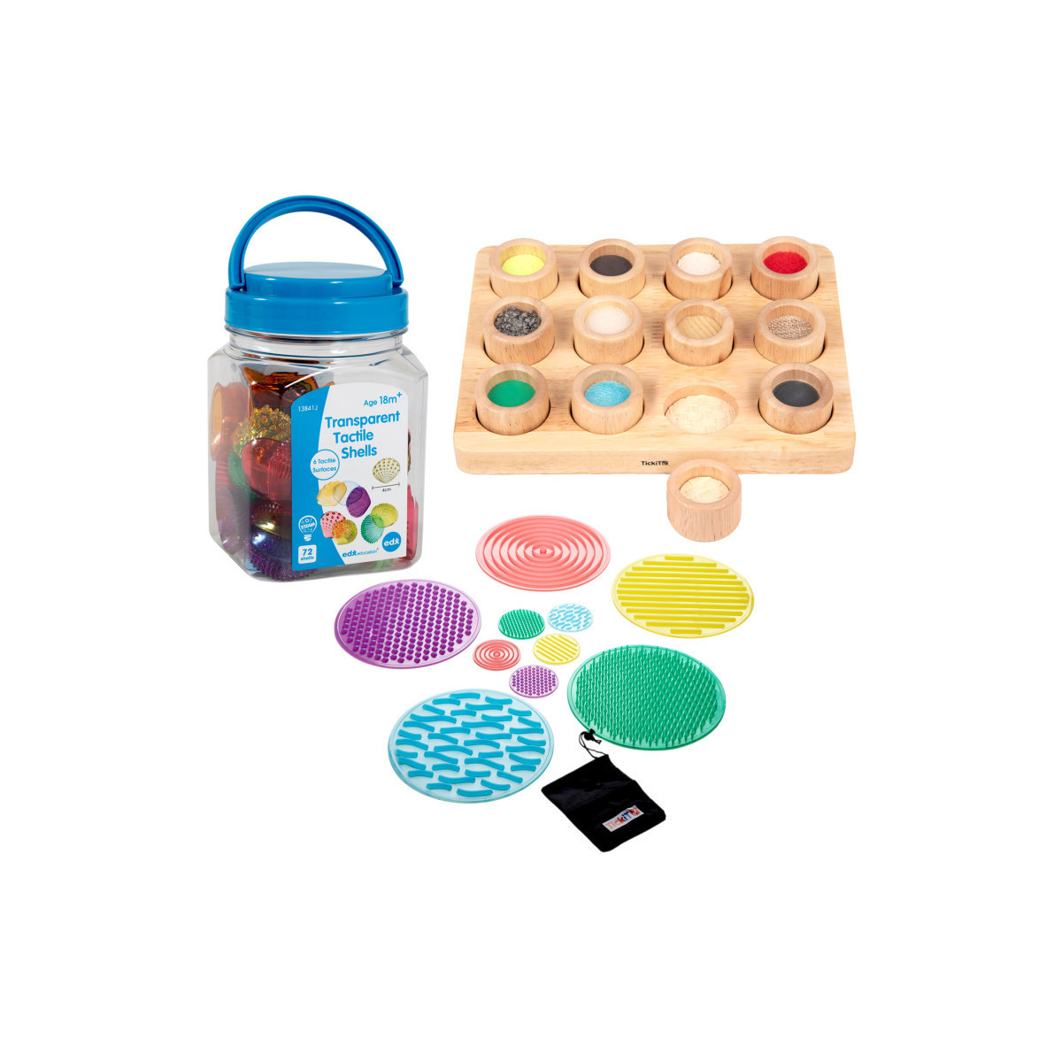 The Sensory Tactile Kit includes a Set of 72 Transparent Tactile Shells, a Touch & Match Board, and a Set of 10 SiliShapes Sensory Circles.