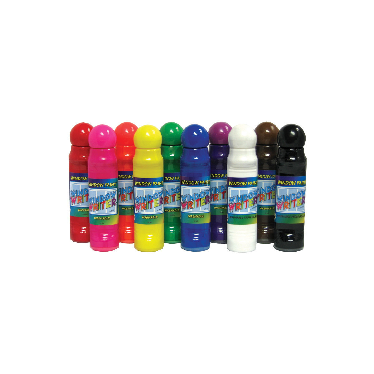 The assorted Crafty Dab Window Paint and Window Writer is a smooth-flowing art tool that is perfect for painting and decorating windows with ease. Bring home the Crafty Dab Window Writers for designing your door windows and car windows; kids will love to play with them and doodle on glass panes. Great for painting hobbies and projects. The paint does not dry up, crack or peel off upon drying and stays for as long as you want. These window paints come in bottles designed with special spring mechanism to prevent leakage and spills. Non-toxic paints safe to use by children. Packed in ergonomically designed bottles with matching caps for easy identification of colors. Includes 10 vibrant colors: Red, Pink, Orange, Yellow, Green, Blue, Purple, White, Black, and Brown. Each bottle includes 1.6 oz. with a 24mm applicator.