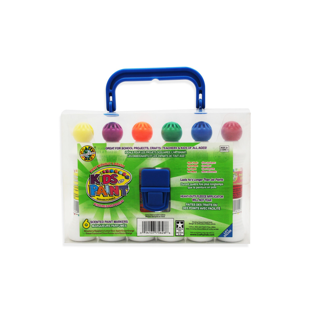 Crafty Dab Kids Paint bottles are "little hand" friendly and the applicators won't leak or drip. When the applicator tip is applied to paper, the vibrant, colorful inks flow to create your little artist's latest masterpiece. Our Crafty Dab products are non-toxic, washable and won't stain clothes. No mess, no waste and cost effective — a one-ounce bottle of Crafty Dab paint is equal to 4-7 ounces of tempera jar paint. Each set of Crafty Dab Kids Paint comes in a convenient, reusable carrying case. Paint is fruit scented and comes in an assortment of vibrant colors. Each pack includes 6 bottles.
