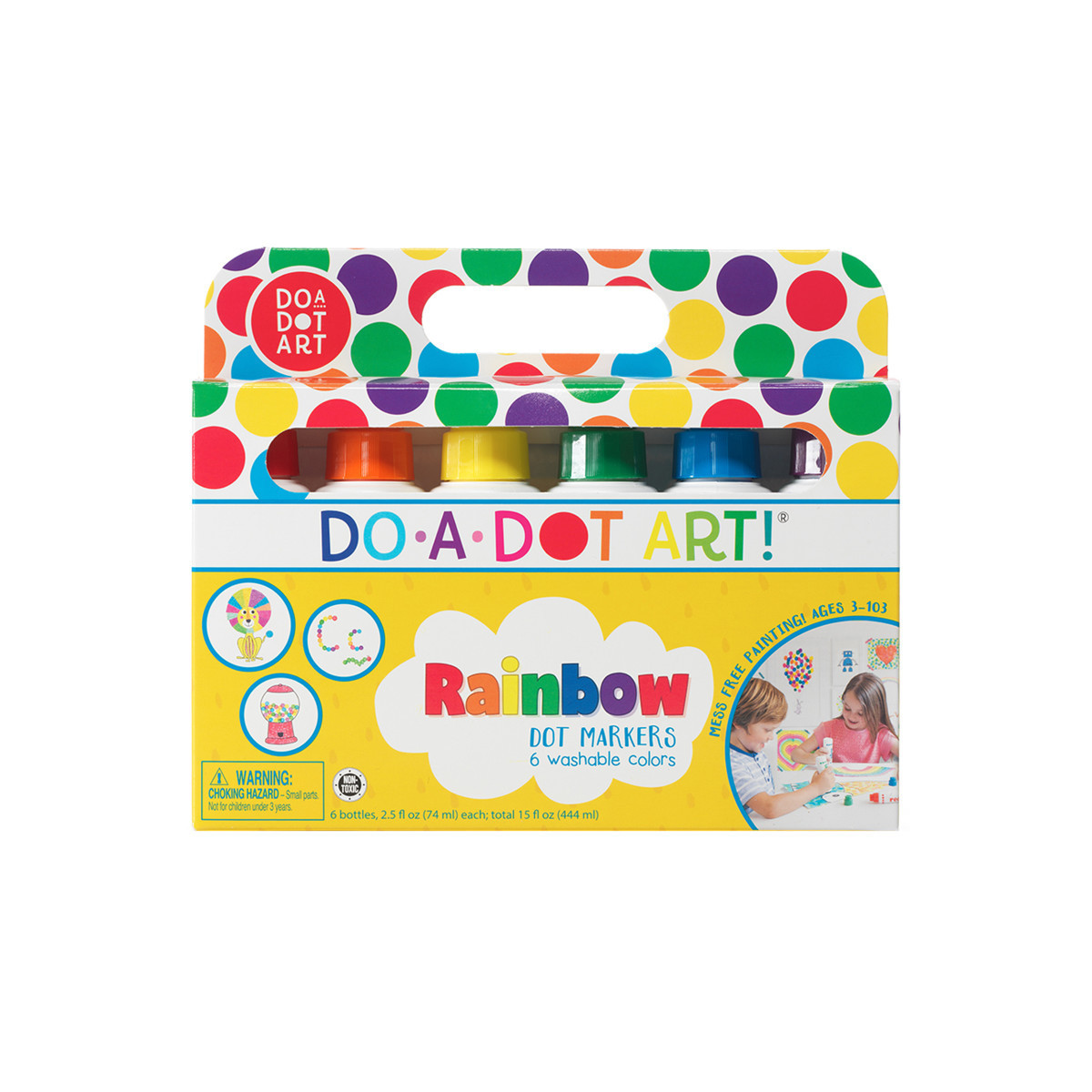 Explore what's over the rainbow and dot away with this set of Do A Dot Art! Rainbow markers. Arts and crafts time just got easier and cleaner with Do A Dot Art! This set comes with 6 washable dot markers in no spill, no splash bottles, which is a dream come true for parents and teachers. Do A Dot Art! is incredible for developing hand eye coordination and color recognition for young children, and is the first art medium every young child should use. Let your imagination run wild with this set of primary rainbow colors. Includes: Red, Orange, Yellow, Green, Blue, and Purple. Washable with easy set-up and easy clean up. Dries quickly. Sponge tips never dry out. Easy to grip bottles for little hands. Special formula allows you to mix, blend, and layer color. Each marker contains 2.5 ounces of ink. Made in the USA.