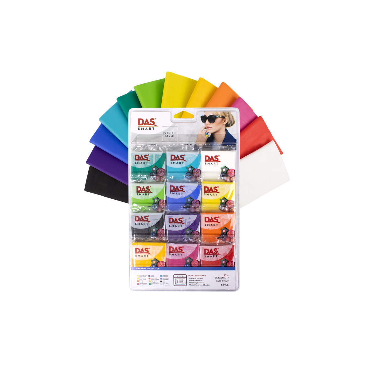 Discover the endless possibilities of DAS Smart, a revolutionary polymer clay designed for creating one-of-a-kind, durable masterpieces. This oven-hardening clay is perfect for artists who demand precision and resilience in their work. Its compact and versatile structure makes it incredibly easy to manipulate, ensuring that your creations maintain their integrity and detail both before and after baking. Available in four expertly curated thematic sets, DAS Smart offers a rich palette of colors that blend and combine seamlessly. Simply bake your creations in a standard kitchen oven at 130°C for up to 30 minutes, and watch as your artwork transforms into a lasting piece. Plus, you can bake your projects multiple times to add intricate details and layers. Includes (12) 1 oz blocks, one each of Lemon Yellow, Warm Yellow, Orange, Geranium Pink, Violet, Scarlet Red, Apple Green, Emerald, Turquoise, Cobalt Blue, Black, and Opal White