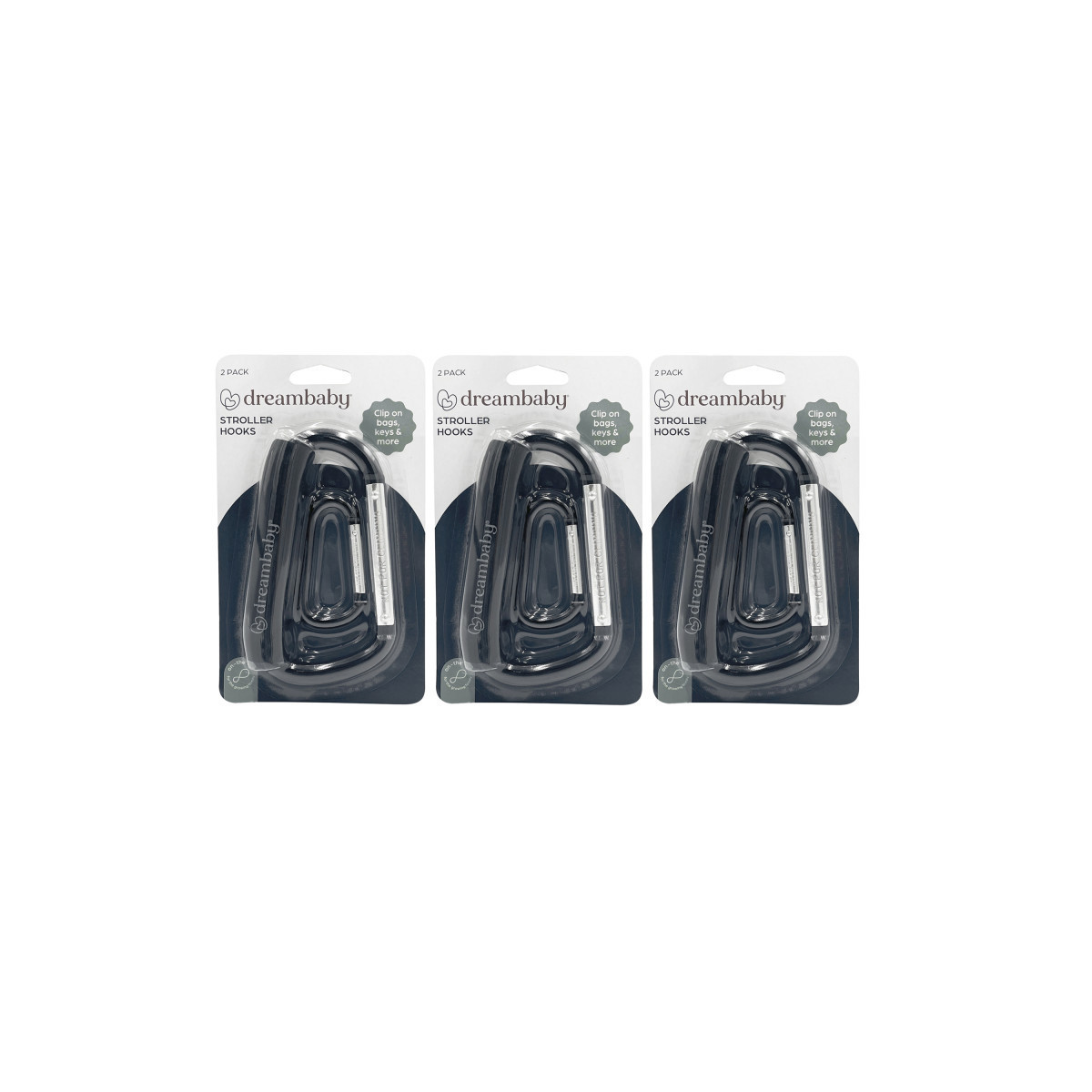 Dreambaby® Stroller Hooks are a practical and versatile solution for parents who need an extra hand while on the go. Featuring a soft yet heavy-duty handle, these hooks easily clip onto almost any stroller handle, making it simple to keep your essentials within reach. Whether you're carrying shopping bags, diaper bags, or handbags, these hooks take the hard work out of hauling your items. Ideal for holidays, just clip on your shopping bag and you're ready to go! They're also great for use on shopping carts, allowing you to conveniently carry your bags with one hand. Each pack includes two hooks—one larger and one smaller—so you can organize all your necessities and keep them easily accessible. Sold as 3 packs for a total of 6 hooks.