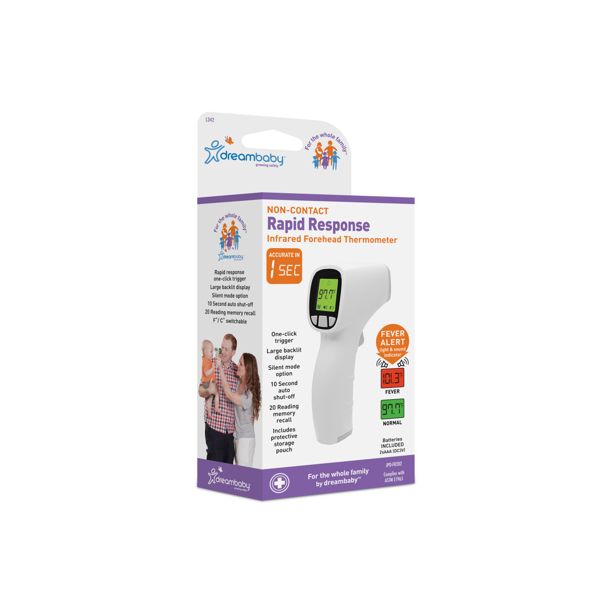 Dream Baby's Non-contact infrared thermometer for the forehead or objects takes temperatures safely, quickly and easily. The back-lit screen is easy to read and features one button operation, automatic shut off after 60 seconds and reads in Fahrenheit and Celsius for your convenience. Safe for newborns and has ear mode for infants above 3 months. The Infrared Thermometer measures body temperature or an object temperature such as water and milk. Includes thermometer, 2 AAA batteries, carrying pouch, and instruction manual.