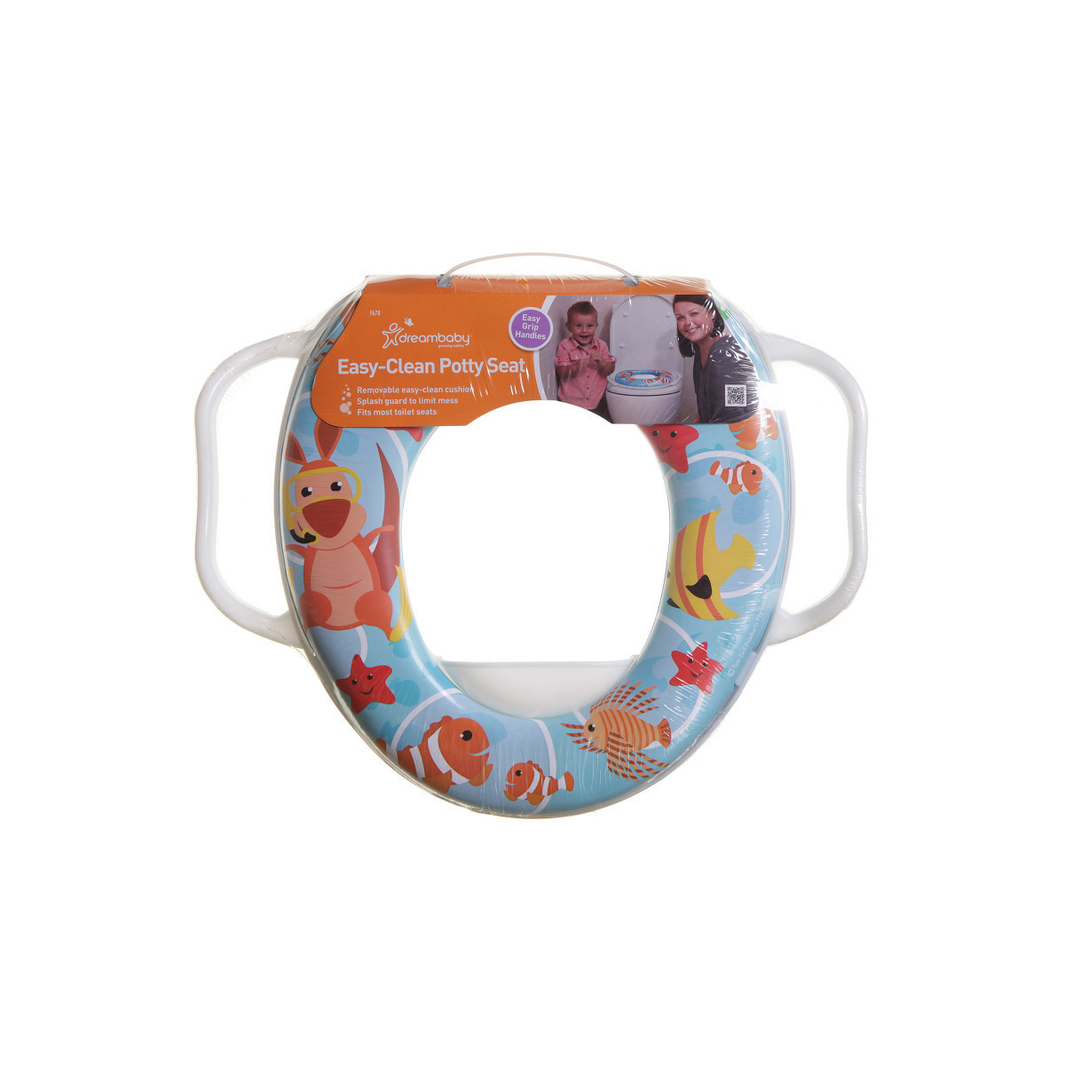 Dreambaby® Easy Clean Potty Seat helps take the stress and mess out of the rewarding yet challenging stage of toilet training your little one. The seat is soft and padded for extra comfort and the easy-grip handles make your child feel safe and secure. Featuring a removable cushion and splash guard, it's easy to clean up any splashes or accidents that may happen. Fits most toilets: 11.75" long x 11" wide cushion (14" with with handles) x 3" depth (including 1.25" snug fit rim).