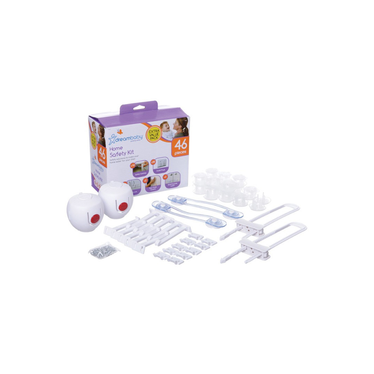 Dreambaby® Home Safety Value Kits 46-pieces provide a one-stop solution to all your childproofing and home safety needs. An essential item on your getting ready for baby checklist. Keep cupboards and drawers securely closed to prevent curious toddlers from slamming their fingers or accessing potentially dangerous contents. Cover dangerous electrical outlets to help protect children from electric shock. Easy to install. Dreambaby® Home Safety Value Kits 46-pieces contain everything you need to help make sure your home is as safe as possible for your little ones. It includes: 10 safety catches, 30 outlet plugs, 2 cabinet sliding locks, 2 multi-purpose latches, and 2 doorknob covers.