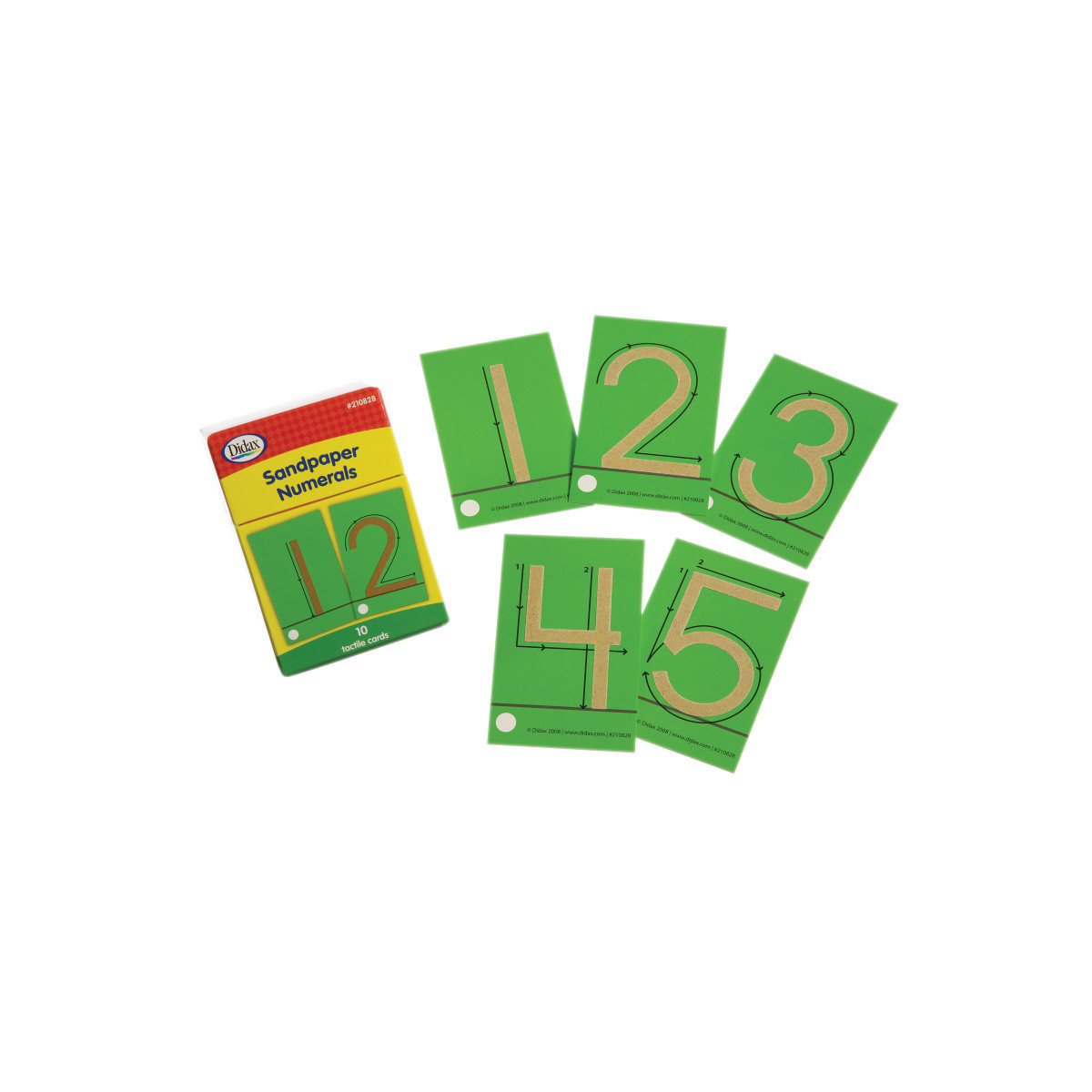 Sandpaper numerals offer an important tactile experience for the young child in learning correct numeral formation. The 2 1/2" numerals have directional arrows next to each numeral to ensure proper formation. Each durable card measures 4 1/4" x 2 5/8".