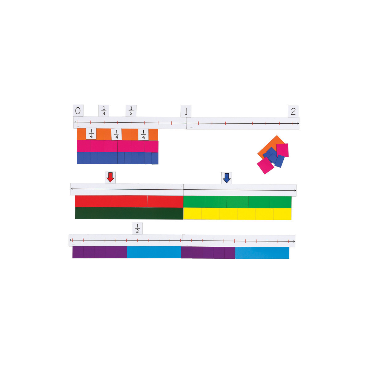 The Magnetic Fraction Number Line includes three number lines (open, eighths, and tenths), each 32 inches long, 60 color-coded magnet pieces (halves, fourths, eighths, sixteenths, thirds, sixths, fifths, and tenths), 9 label magnets, and two arrow magnets