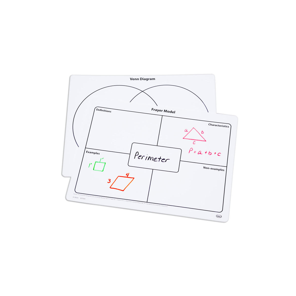 These double-sided mats feature two popular graphics organizers that can be used for a variety of subjects. Mats have the Frayer Model on one side, and a Venn Diagram on the other. Mats measure 9" x 12" and are made of tough, flexible plastic for use with dry-erase markers. Set of 10 mats.