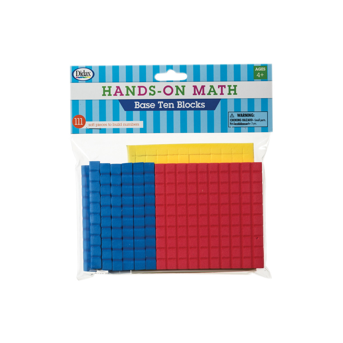 This small set of Base Ten Blocks makes it easy and affordable to get children learning the hands-on way! Set includes 111 foam pieces: 1 Hundred Flat, 10 Ten Rods, and 100 Unit Cubes. Great for parents and as a starter set for teachers. Easy-to-use activities are included.