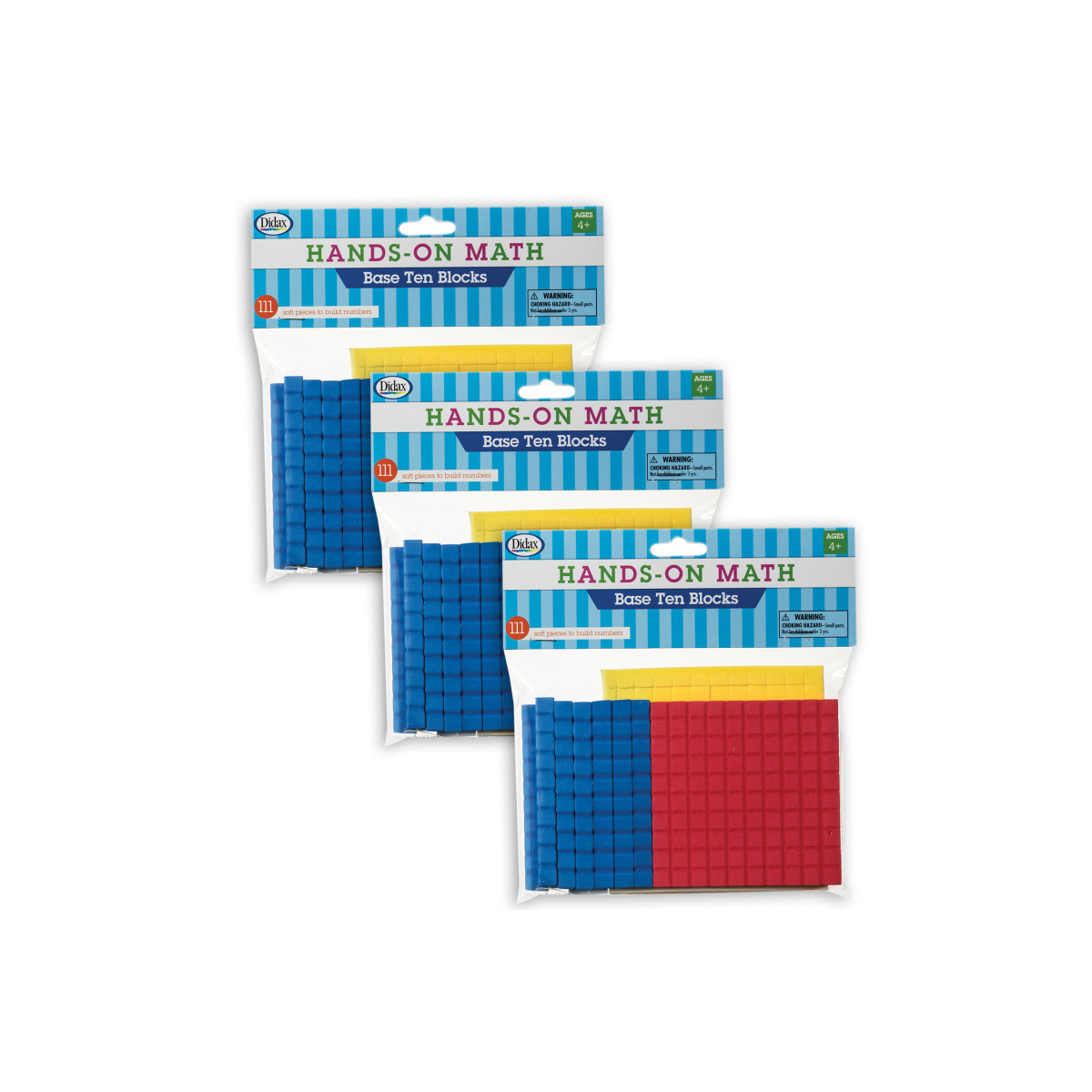This small set of Base Ten Blocks makes it easy and affordable to get children learning the hands-on way! Great for parents and as a starter set for teachers. Easy-to-use activities are included. Each pack includes 111 foam pieces: 1 Hundred Flat, 10 Ten Rods, and 100 Unit Cubes. Sold as 3 packs for a total of 333 foam pieces.