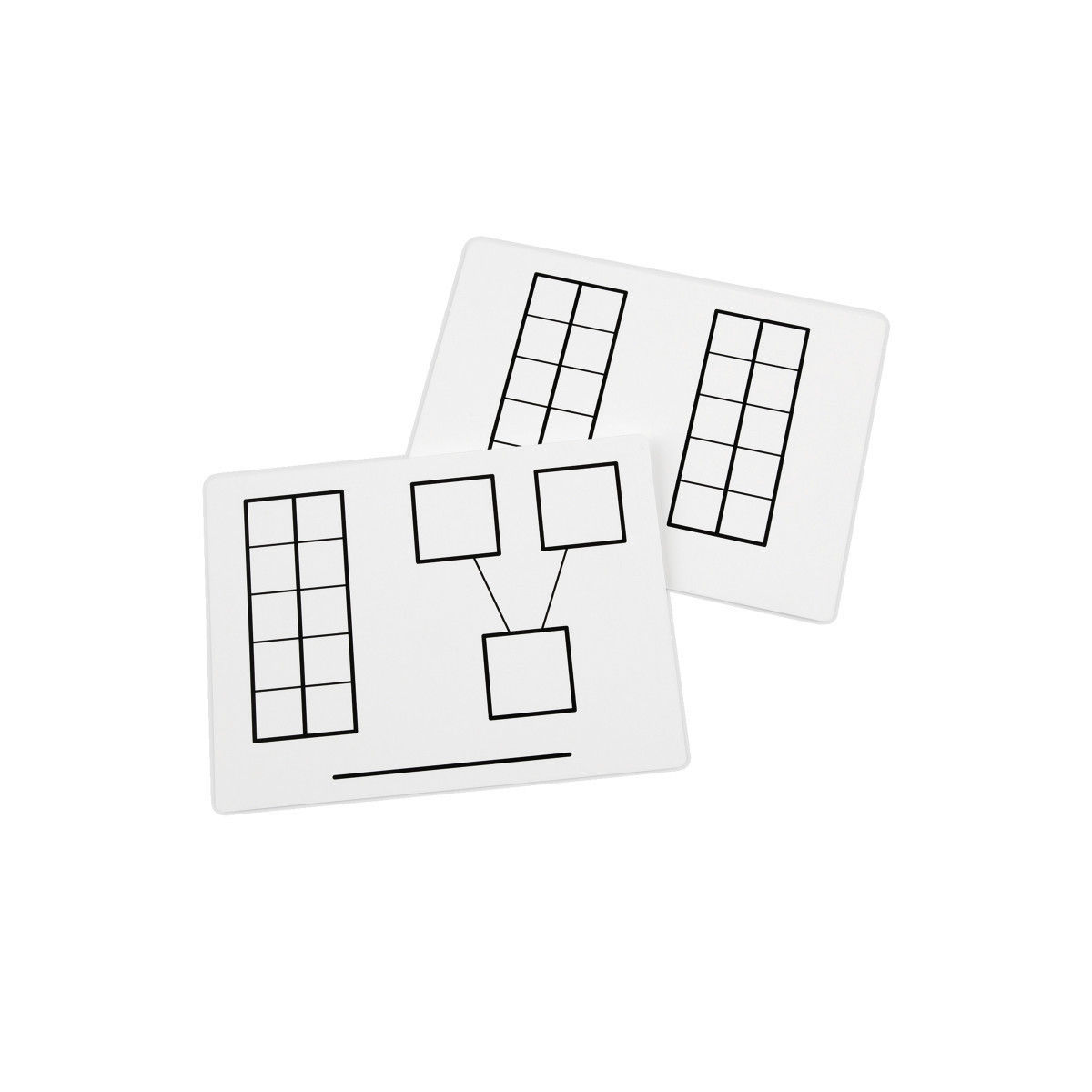 Tough, flexible plastic mat has ten frame and number bond outline on one side and two ten frames on reverse. For use with dry-erase markers. Mats measure 9" x 12". Pack of 10.