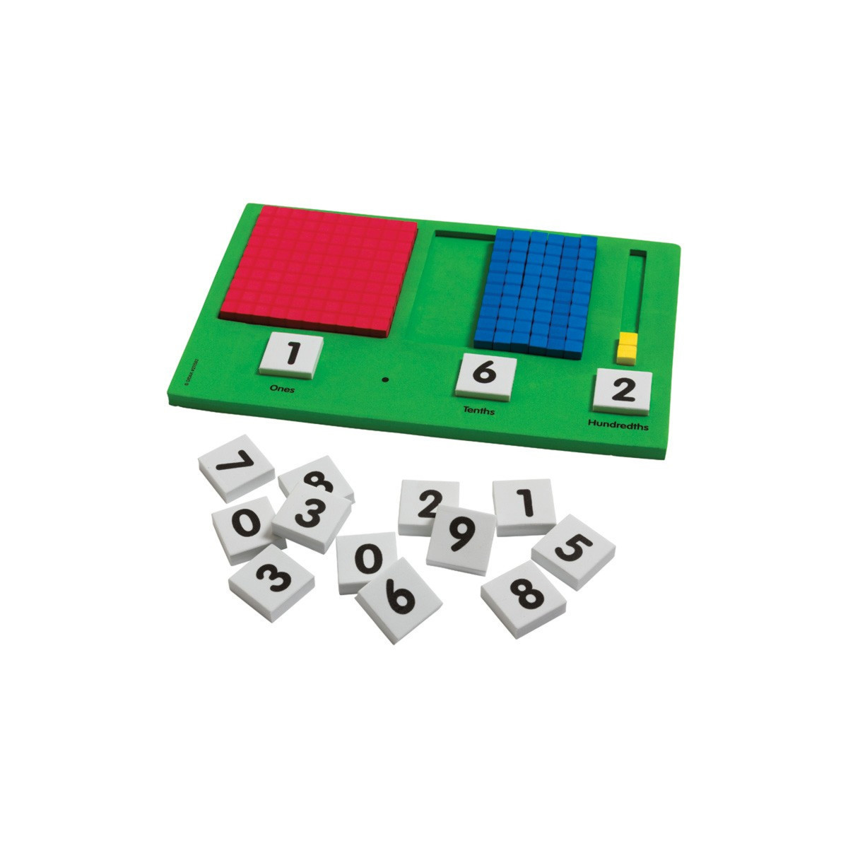 Students will learn to model ones, tenths, and hundredths with this innovative foam frame. Use with standard 1-centimeter base ten blocks (sold separately) to represent and work with decimal numbers and equations. Includes frame, 21 number tiles, and teaching notes with activities for math standards.11" x 7". Grades 3-5.