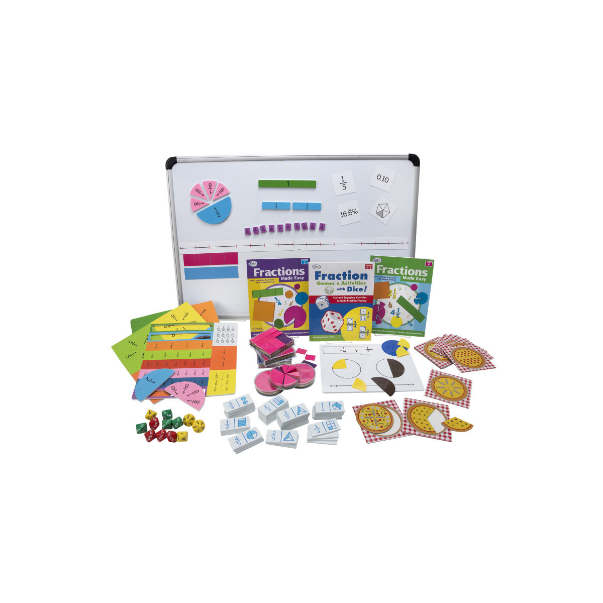 This kit includes many hands-on manipulatives and 3 activity-packed resources full of teaching ideas for teaching and working with fractions. Kit Includes Fraction Squares, 3 sets; Fraction Circles, 3 sets; Write-On/Wipe-Off Fraction Mats, set of 10; Fractions Made Easy, Grade 3; Fractions Made Easy, Grade 4; Fraction Games & Activities with Dice, Grades 3–5; Magnetic Fraction Tiles; Hands-On Math Fraction Dominoes, 2 sets ; Hands-On Math Fraction Pizzas, 2 sets; Magnetic Equivalent Fractions; Magnetic Fraction Number Line; Jumbo Equivalence Dice, 10-sided, set of 12.