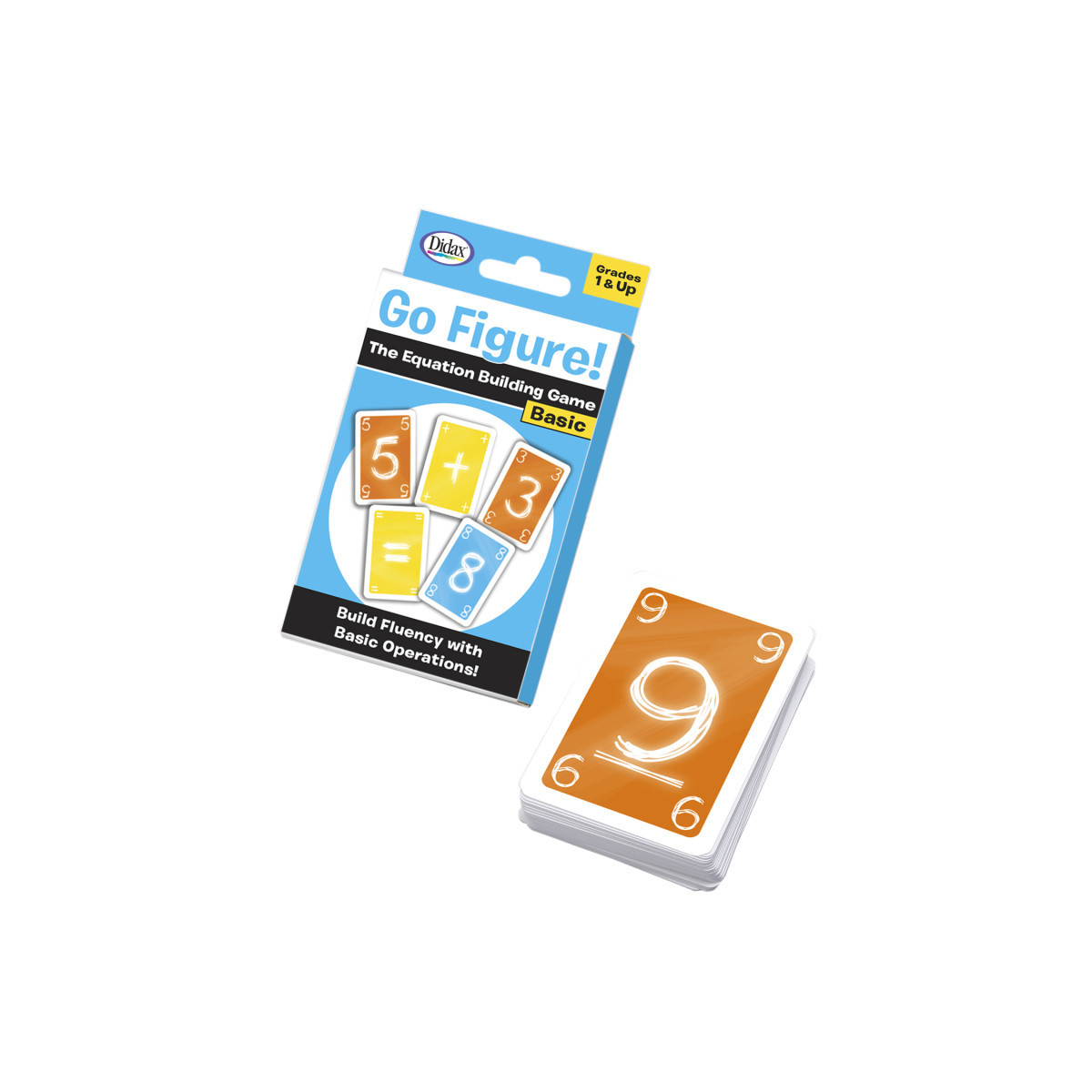In this fast-paced, challenging game, children practice their fluency facts as they take turns building equations. The first player begins by creating an equation with the cards from their hand. Play continues as other players create new equations with their cards. Change the numbers! Change the operators! Just be sure your equation works! Be the first to use all your cards to win! Go Figure! Basic includes 50 number cards, 5 operations cards (+, –, x, ÷, =) and 2 wild cards.