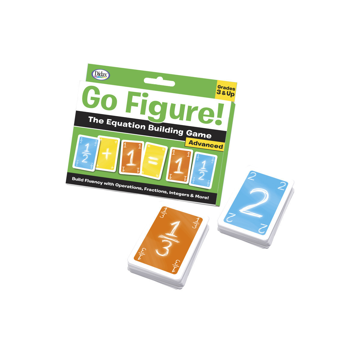 In this fast-paced, challenging game, children practice their fluency facts as they take turns building equations. The first player begins by creating an equation with the cards from their hand. Play continues as other players create new equations with their cards. Change the numbers! Change the operators! Just be sure your equation works! Be the first to use all your cards to win! Use these more advanced fractions, integers, variables, squares and square roots cards in conjunction with the Basic number and operations cards to build equations. Includes 107 cards.