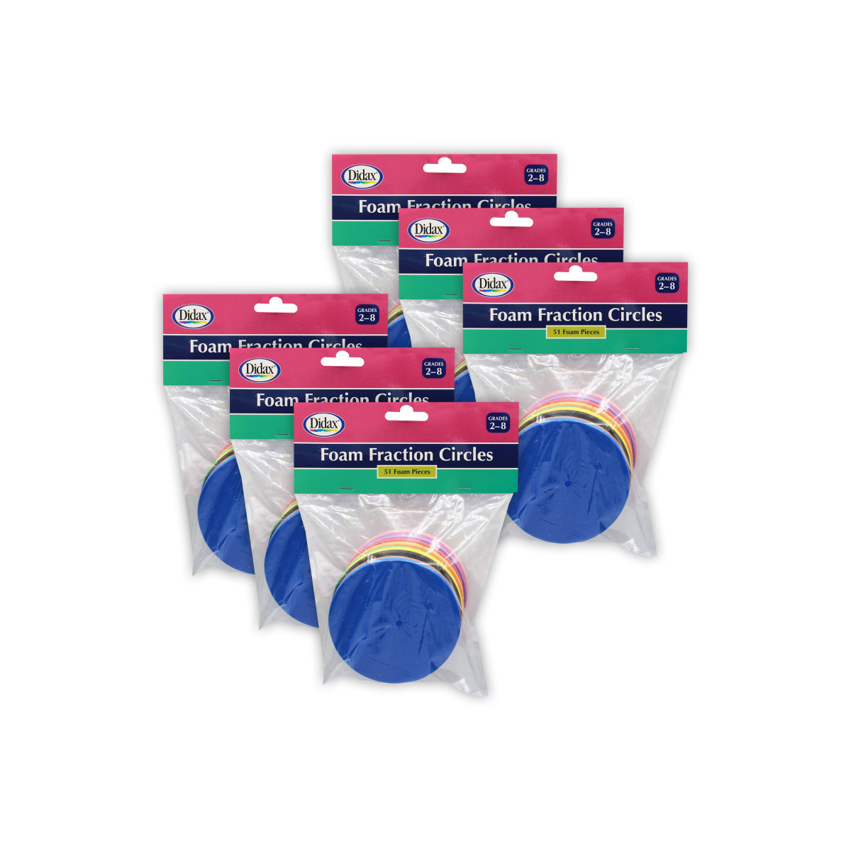 Eight color-coded circles in fractions of 1/2, 1/3, 1/4, 1/5, 1/6, 1/8, 1/10, 1/12 plus one whole. Made of dense foam, these circles are easy to handle and stay put nicely. Set has a 3.5" diameter. Each set includes 51 pieces, 1/2 cm thick. Sold as 6 sets for a total of 306 pieces.