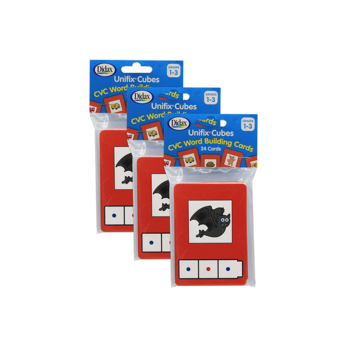 Set of laminated cards with picture and color cues for children to build three-letter words with Unifix Letter Cubes CVC sets. Color illustrations of common objects and animals. Use with Unifix Letter Cubes (sold separately). Each pack includes 24 cards. Sold as 3 packs for a total of 72 cards.