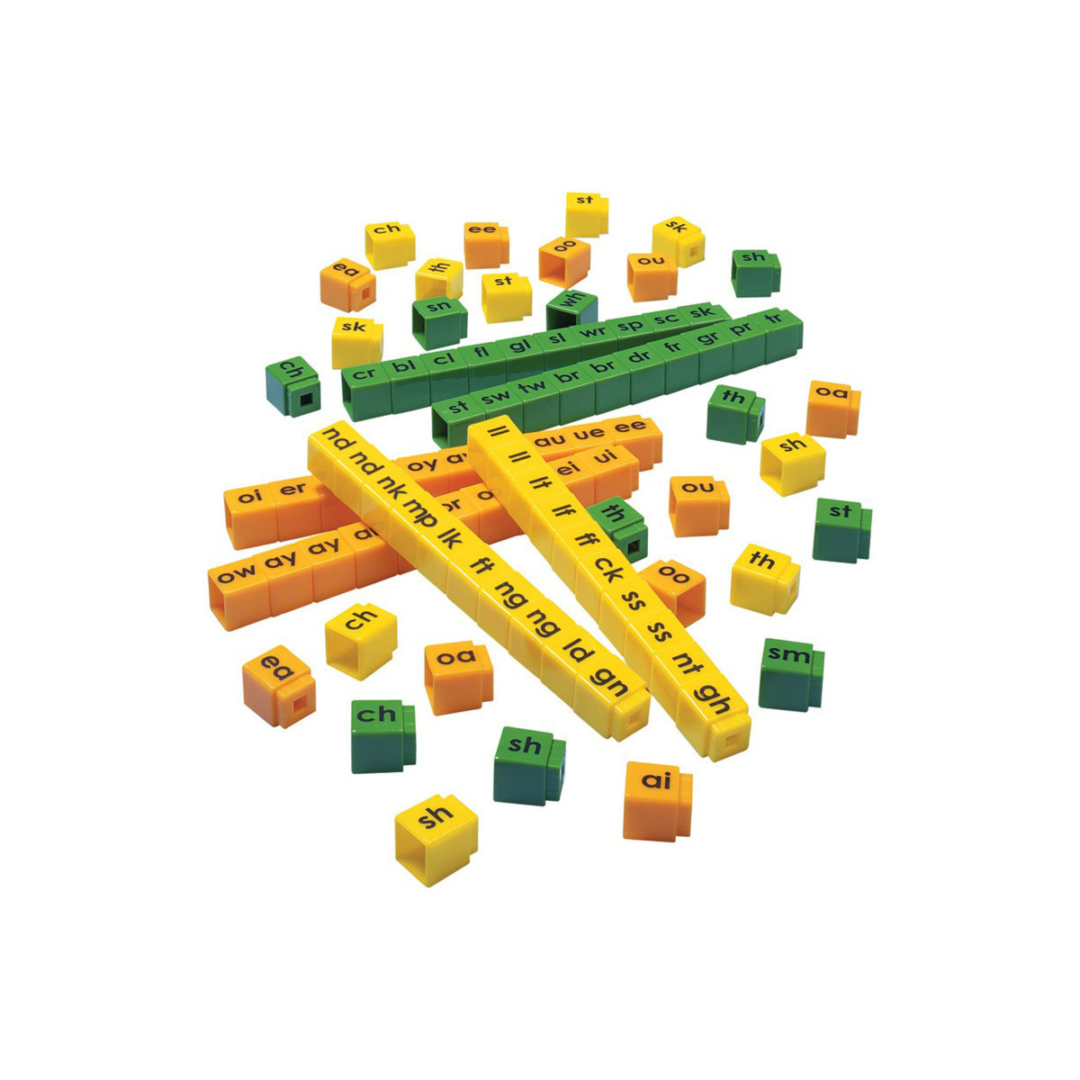 Use our blends cubes together with CVC cubes to create thousands of sounds and words! This set of 90 cubes includes the most frequently used two-letter initial blends, medial blends, digraphs and diphthongs. The initial blends and digraphs are green, the medial vowels are orange, and the ending blends and digraphs are yellow. The Unifix Blend Cubes Set includes an equal amount of each color. Excellent resource for your hands-on, visual/spatial learners. Packaged in plastic storage container. Starter set for 1-2 students.