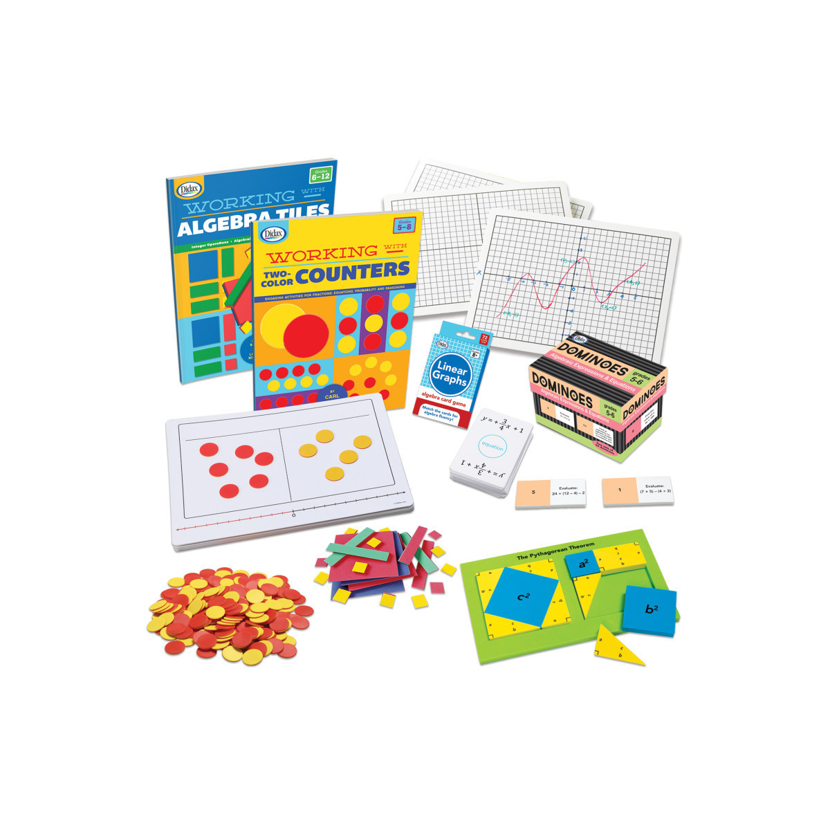 Kit includes: Algebraic Expression Dominoes, Algebra Tiles (10 sets), Working with Algebra Tiles, Linear Graphs Card Game, Integer Operations Mats (Set of 10), Working with Two-Color Counters, Two-Color Counters (Set of 200), Write-On/Wipe-Off Coordinate Grid Mats (Set of 10), and Pythagorean Theorem Tile Set.