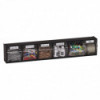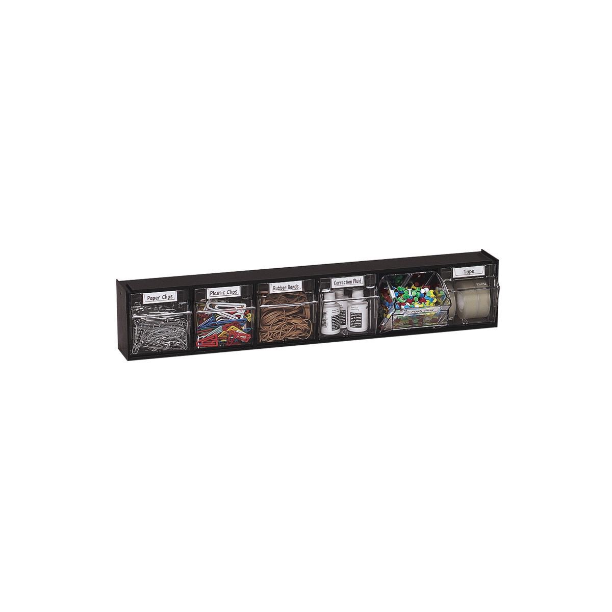 Tilt Bin® horizontal interlocking storage system allows you to stack and connect to form a custom modular system. Transparent bins tilt out and stay open while in use. Can be wall mounted or used on countertop. Identification labels and mounting hardware included. Bins can be easily removed from locking mechanism for cleaning and refilling. Includes 6 bins. Each bin measures 3-1/2"W x 3-3/4"H x 2-5/8"D. Unit measures 23-5/8"W x 4-1/2"H x 3-5/8"D.